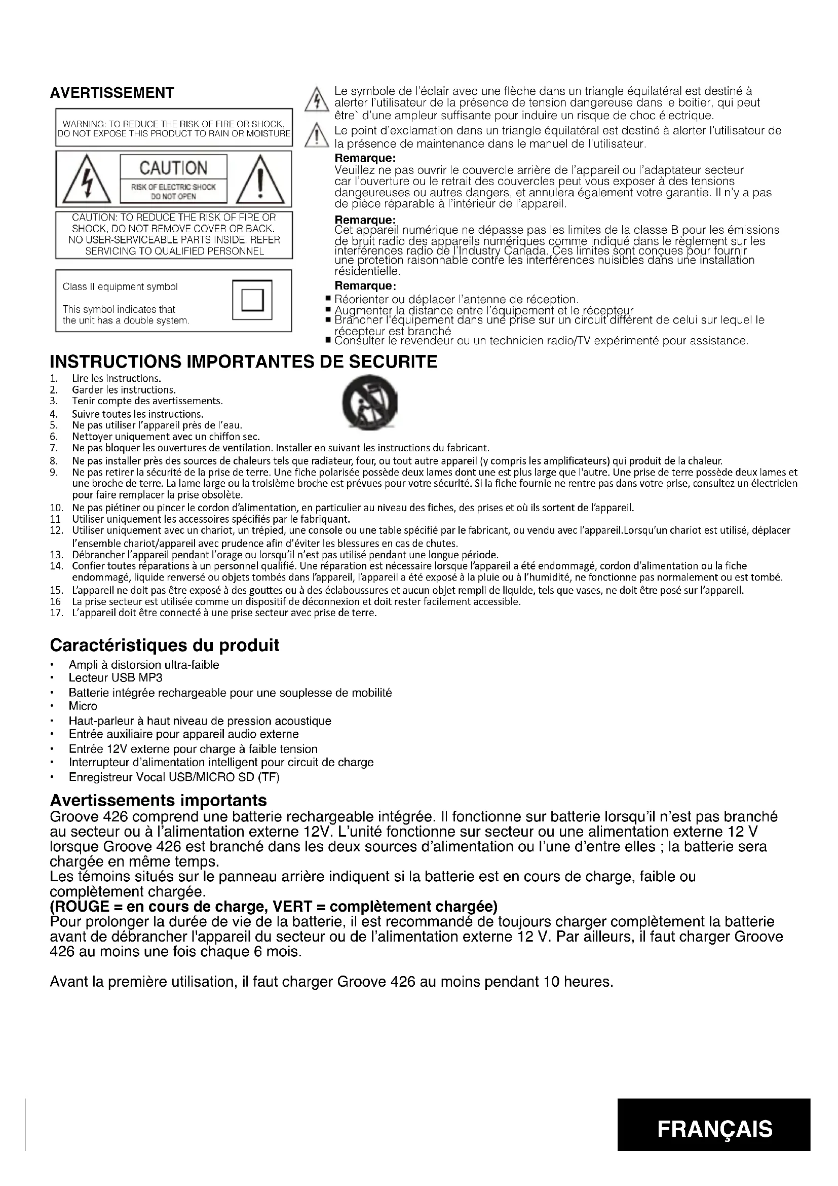 Pour prolonger la durée de vie de la batterie, il est recommandé de tous les jours charger complètement la batterie avant de débrancher l'appareil du secteur ou de l'alimentation externe 12 V. Par ailleurs, il faut charger Groove 426 au moins une fois chaque 6 mois.