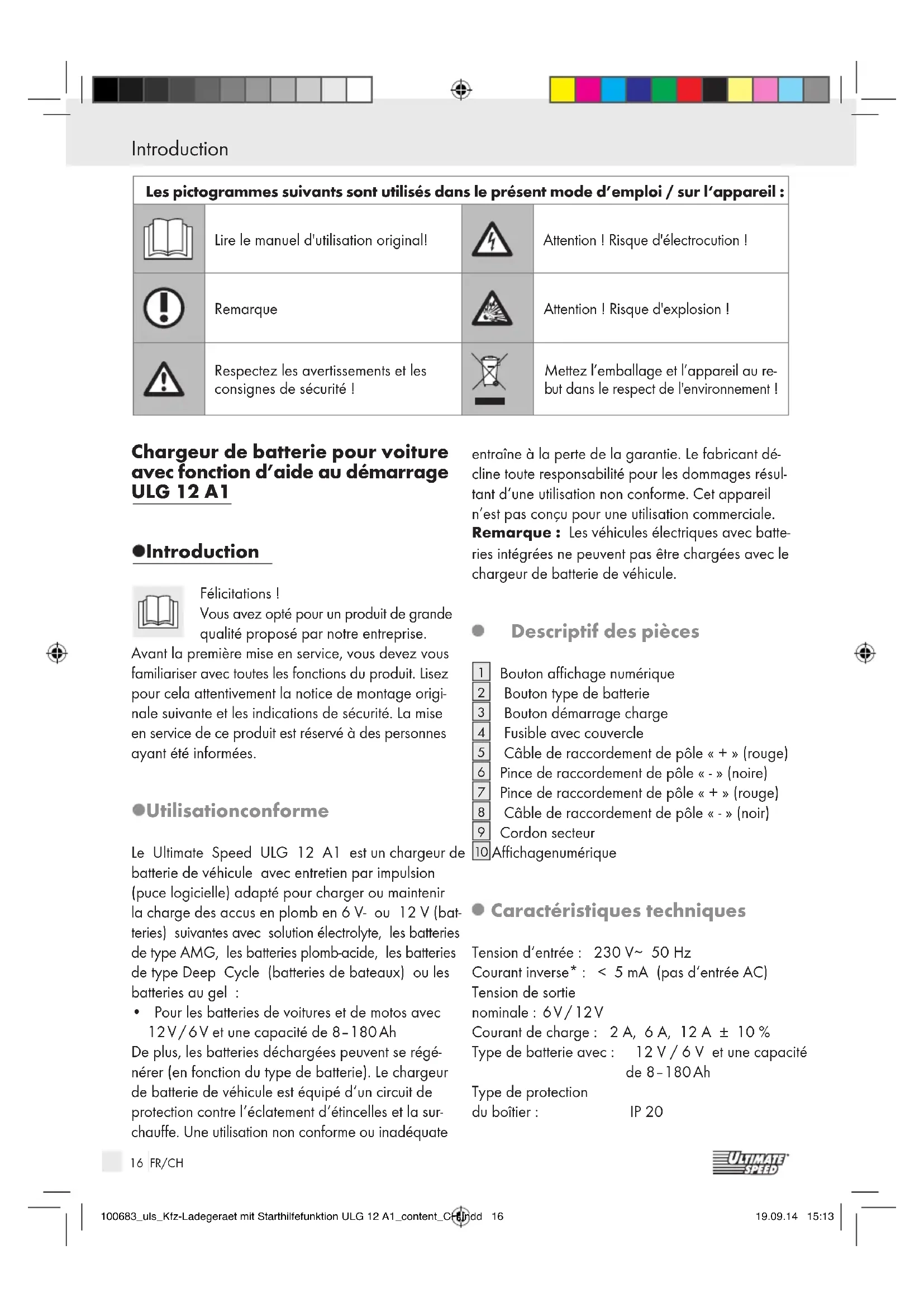 bestimmter gefährlicher Stoffe in Elektro- und Elek- tronikgeräten festgelegt sind. Für die Konformitätsbewertung wurden folgende harmonisierte Normen herangezogen: EN 60335-2-29 / A2:2010 EN 60335-1:2012 EN 62233:2008 EN 50498:2010 EN 55014-1:2006+A1:2009+A2:2011 EN 61000-3-2:2006+A1:2009+A2:2009 EN 61000-3-3:2008 St. Ingbert, 30.09.2014 Markus Zimmer - Leiter Qualitätssicherung - 100683_uls_Kfz-Ladegeraet mit Starthilfefunktion ULG 12 A1_content_CH.indd 14 19.09.14 15:1315 FR/CH Table des matières EG-Konformitätserklärung Introduction Utilisation conforme ............................................................................................................................Page 16 Descriptif des pièces ...........................................................................................................................Page 16 Caractéristiques techniques ................................................................................................................Page 16 Contenu de la livraison .......................................................................................................................Page 17 Indications de sécurité .........................................................................................................Page 17 Utilisation Caractéristiques du produit ................................................................................................................Page 19 Raccordement .....................................................................................................................................Page 19 Déconnexion .......................................................................................................................................Page 19 Sélectionner le mode de charge ........................................................................................................ Page 19 Utilisation de la fonction d‘aide au démarrage ................................................................................ Page 21 Remplacent du fusible .........................................................................................................................Page 22 Maintenance et entretien ..................................................................................................Page 22 Remarques sur la garantie et le service après-vente Conditions de garantie .......................................................................................................................Page 22 Étendue de la garantie .......................................................................................................................Page 22 Faire valoir sa garantie .......................................................................................................................Page 23 Indications relatives à l‘environnement et à la mise au rebut ..........Page 23 Déclaration de conformité ................................................................................................ Page 24 100683_uls_Kfz-Ladegeraet mit Starthilfefunktion ULG 12 A1_content_CH.indd 15 19.09.14 15:1316 FR/CH Introduction Introduction / Indications de sécurité Chargeur de batterie pour voiture avec fonction d’aide au démarrage ULG 12 A1 Introduction Félicitations ! Vous avez opté pour un produit de grande qualité proposé par notre entreprise. Avant la première mise en service, vous devez vous familiariser avec toutes les fonctions du produit. Lisez pour cela attentivement la notice de montage origi- nale suivante et les indications de sécurité. La mise en service de ce produit est réservé à des personnes ayant été informées. Utilisation conforme Le Ultimate Speed ULG 12 A1 est un chargeur de batterie de véhicule avec entretien par impulsion (puce logicielle) adapté pour charger ou maintenir la charge des accus en plomb en 6 V- ou 12 V (bat- teries) suivantes avec solution électrolyte, les batteries de type AMG, les batteries plomb-acide, les batteries de type Deep Cycle (batteries de bateaux) ou les batteries au gel :