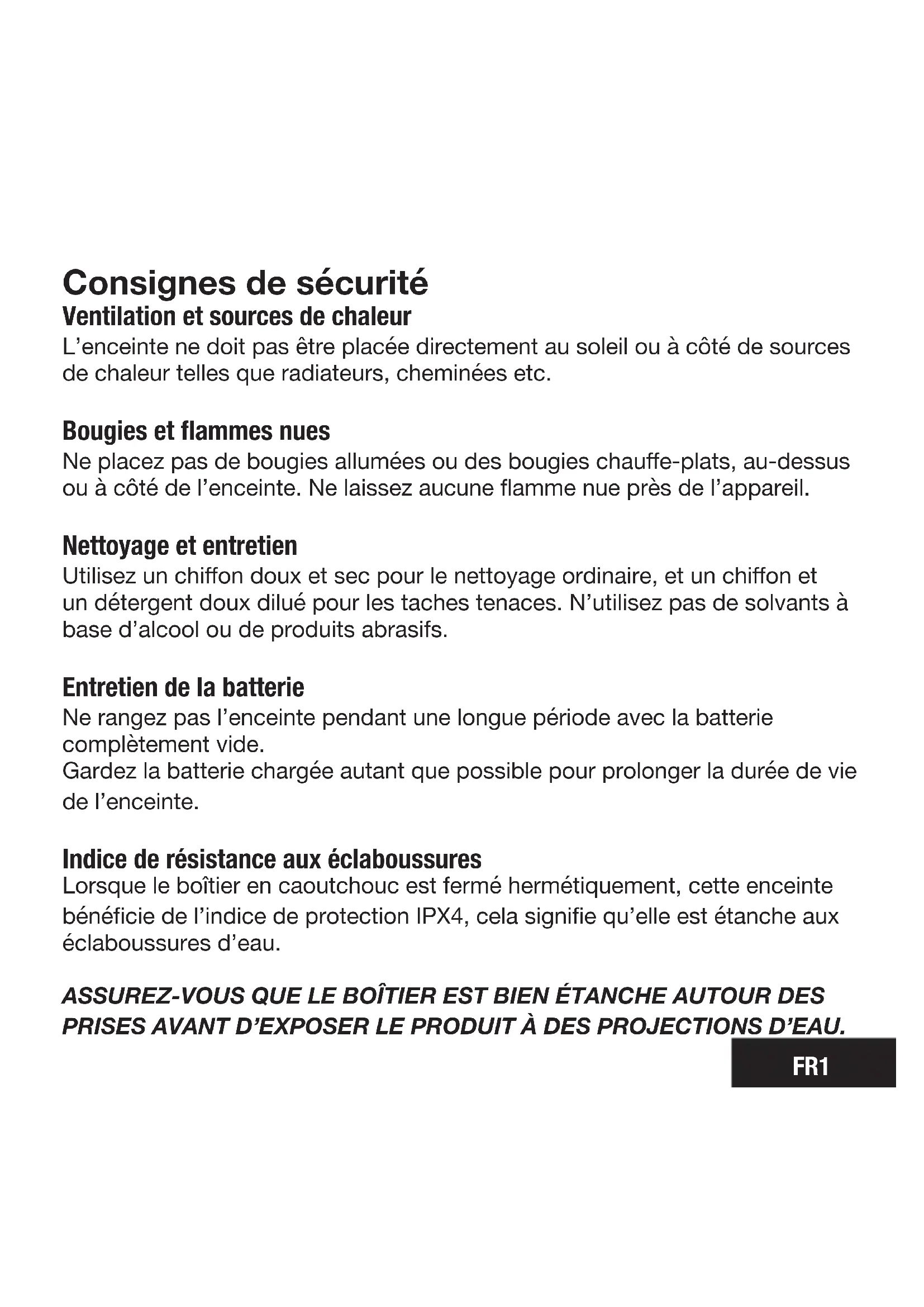 L'enceinte ne doit pas etre place directement au soleil ou a cote de sources de chaleur telles que radiateurs, cheminées etc.