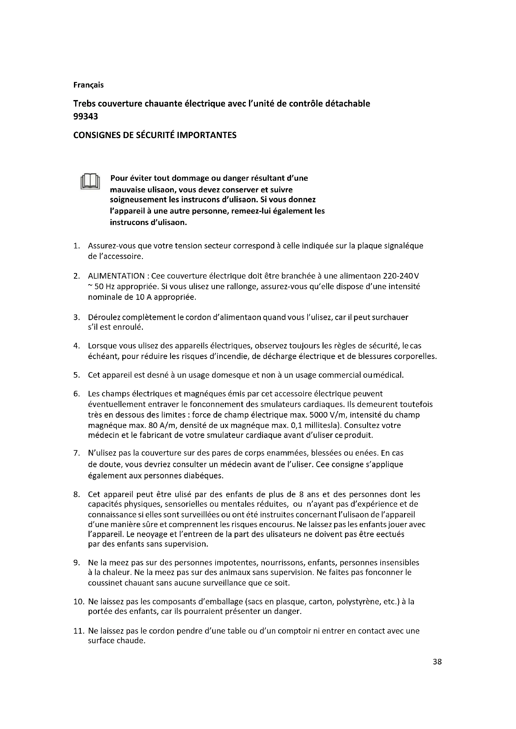 Consignes de sécurité spéciales : – elle doit être branchée à une alimentation 220-240 V ~ 50 Hz appropriée – ne l’allumez pas et ne l’utilisez pas quand elle est pliée ou froissée. – ne la bordez pas ou ne la fixez pas (particulièrement si vous utilisez des matelas séparés ou des canapés rabattables. – ne la pliez pas brusquement – ne l’utilisez pas avec des animaux – ne l’utilisez pas si elle est mouillée ou humide – ne l’utilisez pas si elle a des plis, évitez de la froisser, n’insérez pas d’épingles dans la couverture électrique, ne l’utilisez pas si elle est humide ou a été éclaboussée. – lorsque la couverture chauffante est allumée, il ne doit pas y avoir d’objets (par exemple, une valise ou un panier à linge), d’éléments chauffants tels que des bouteilles d’eau chaude ou des coussins chauffants dessus – l’interrupteur ne doit pas être couvert de couvertures, oreillers, etc., et ne doit pas être posé dessus – ne tirez pas sur le cordon, ne le retournez pas ou ne le pliez pas brusquement – L’accessoire ne doit pas être utilisé par de jeunes enfants âgés de plus de trois ans, à moins qu’un parent ou un tuteur n’ait préréglé les commandes, ou à moins qu’ils n’aient reçu des instructions adéquates sur la manière de les utiliser en toute sécurité. Les enfants de moins de trois ans ne doivent pas utiliser cet accessoire en raison de leur incapacité à réagir en cas de surchauffe. – Il faut régulièrement vérifier l’accessoire pour détecter les signes d’usure ou de dommage.