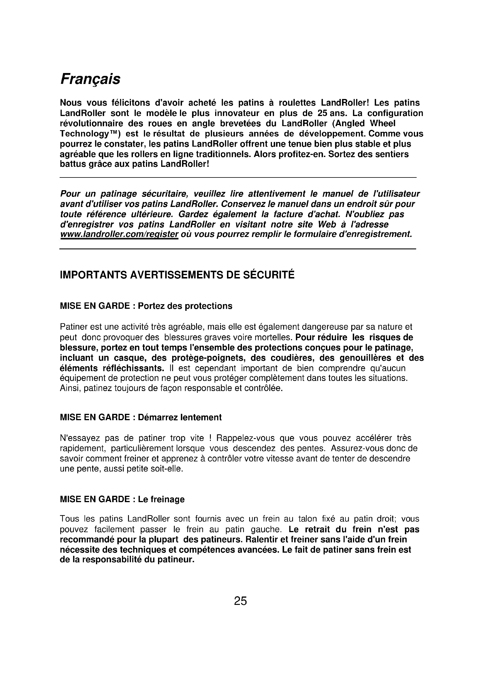 Pour un patinage sécuritaire, veuillez lire attentivement le manuel de l'utilisateur avant d'utiliser vos patins LandRoller. Conservez le manuel dans un endroit sûr pour toute référence ultérieure. Gardez également la facture d'achat. N'oubliez pas d'enregistrer vos patins LandRoller en visitant notre site Web à l'adresse www.landroller.com/register où vous pourrez remplir le formulaire d'enregistrement.