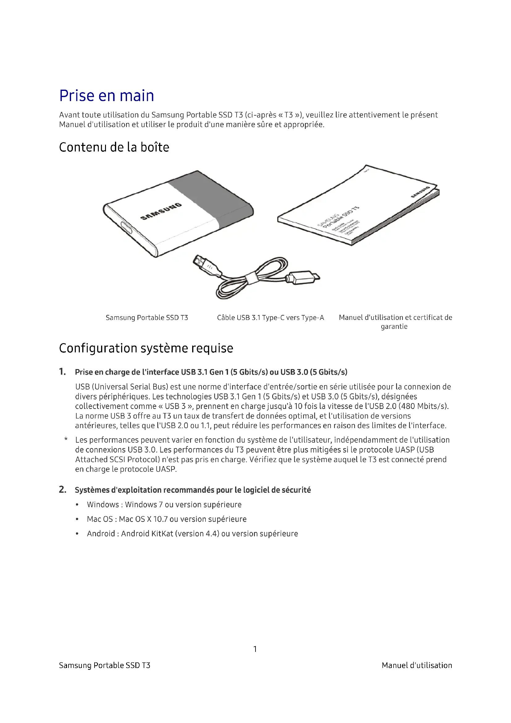 Windows : Windows 7 ou version supérieure Mac OS : Mac OS X 10.7 ou version supérieure Android : Android KitKat (version 4.4) ou version supérieure2 Samsung Portable SSD T3 Manuel d'utilisation