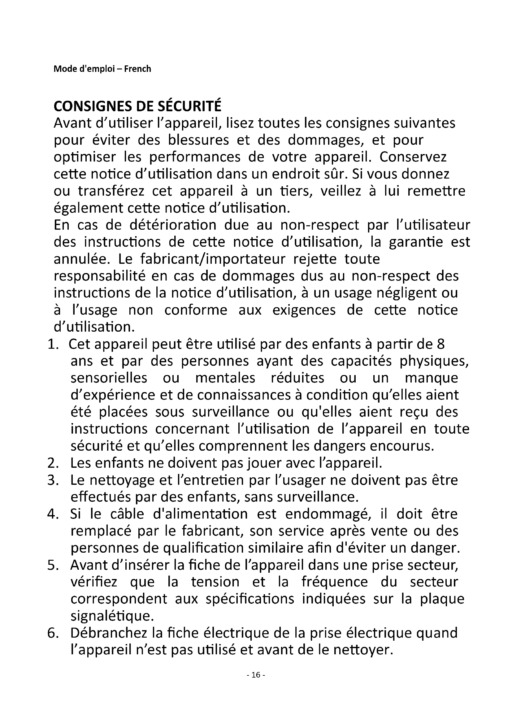 Avant d’utiliser l’appareil, lisez toutes les consignes suivantes pour éviter des blessures et des dommages, et pour optimiser les performances de votre appareil. Conservez cette notice d’utilisation dans un endroit sûr. Si vous donnez ou transférez cet appareil à un tiers, veillez à lui remettre également cette notice d’utilisation. En cas de détérioration due au non-respect par l’utilisateur des instructions de cette notice d’utilisation, la garantie est annulée. Le fabricant/importateur rejette toute responsabilité en cas de dommages dus au non-respect des instructions de la notice d’utilisation, à un usage négligent ou à l’usage non conforme aux exigences de cette notice d’utilisation.