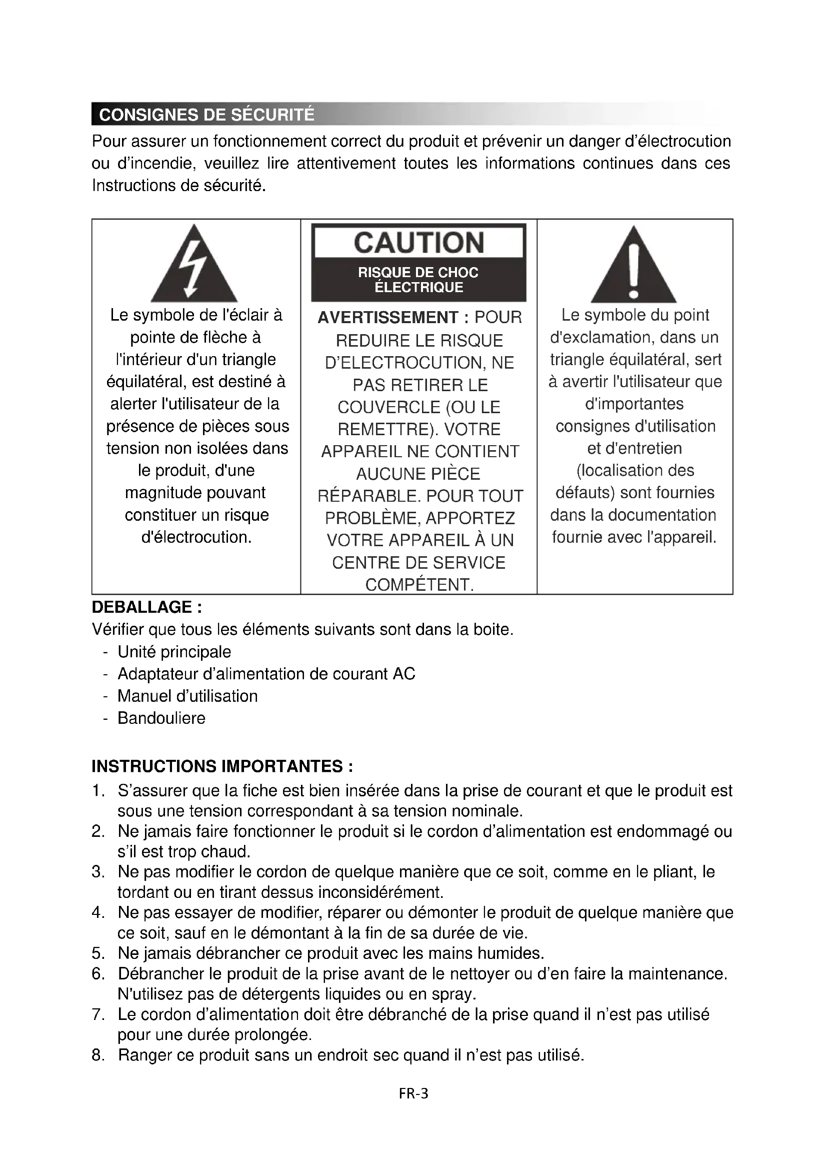 Pour assurer un fonctionnement correct du produit et prévenir un danger d'électrocution ou d'incendie, veuillez lire attentivement toutes les informations continues dans ces Instructions de sécurité.