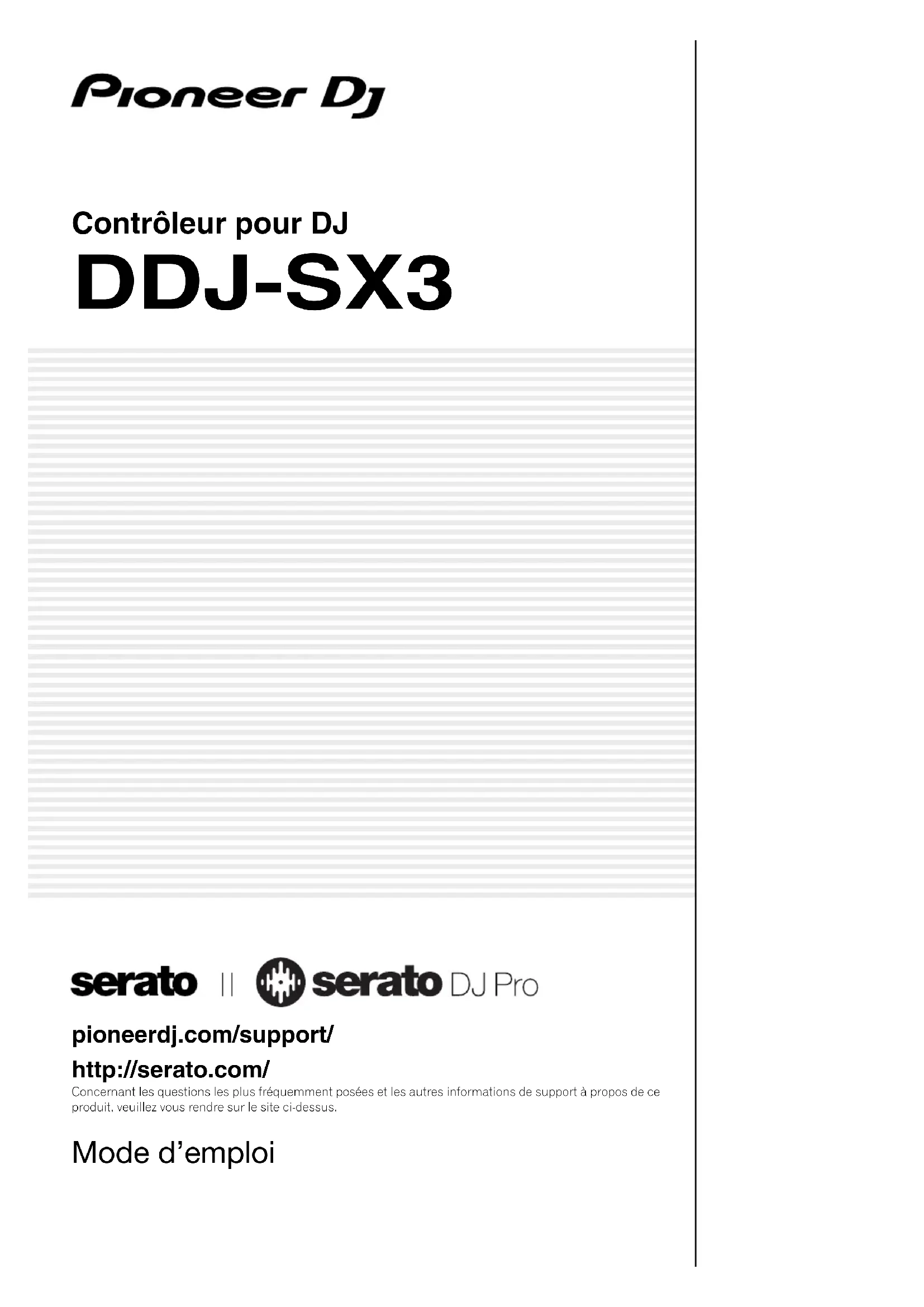 doit être installé afin de visualiser les fichiers en format PDF. Afficher le Mode d’emploi 1 Lancez un navigateur Web sur le PC/Mac pour accéder au site Pioneer DJ ci-après. pioneerdj.com ! Pour sélectionner votre langue, cliquez sur l’icône du drapeau en haut à droite de l’écran. 2 Pointez le curseur sur [Aide]. 3 Cliquez sur [Tutoriels, manuels & documentation]. 4 Cliquez sur [DDJ-SX3] sous [CONTRÔLEUR DJ]. 5 Sélectionnez la langue du manuel à partir de la liste. Téléchargez le manuel si nécessaire. Télécharger le manuel du logiciel Serato DJ Pro 1 Accédez au site Serato. http://serato.com/ 2 Cliquez sur [Serato DJ Pro] à partir du [PRODUCTS]. 3 Cliquez sur [DOWNLOAD SERATO DJ PRO]. 4 Cliquez sur [Manuals and Downloads]. 5 Cliquez sur la langue requise du manuel du logiciel Serato DJ Pro. Installer le logiciel Avant d’installer le pilote Le logiciel Serato DJ Pro et son pilote ne sont pas inclus. Accédez et téléchargez le logiciel depuis le site de support Pioneer DJ. pioneerdj.com/support/ ! L’utilisateur est chargé de préparer le PC/Mac, les périphériques réseau et autres éléments nécessaires pour utiliser Internet afin de s’y connecter. Télécharger le pilote 1 Lancez un navigateur Web sur le PC/Mac pour accéder au site Pioneer DJ. pioneerdj.com ! Pour sélectionner votre langue, cliquez sur l’icône du drapeau en haut à droite de l’écran. 2 Pointez le curseur sur [Aide]. 3 Cliquez sur [Mise à jour des logiciels internes et externes]. 4 Cliquez sur [DDJ-SX3] sous [CONTRÔLEUR DJ]. 5 Cliquez sur [Drivers]. 6 Cliquez sur [Lien de téléchargement], puis sauvegardez le fichier. À propos du logiciel Serato DJ Pro Serato DJ Pro est une application du logiciel professionnel DJ de Serato Limited. Des performances DJ sont possibles en reliant le PC/Mac, sur lequel ce logiciel est installé, à cet appareil.Fr