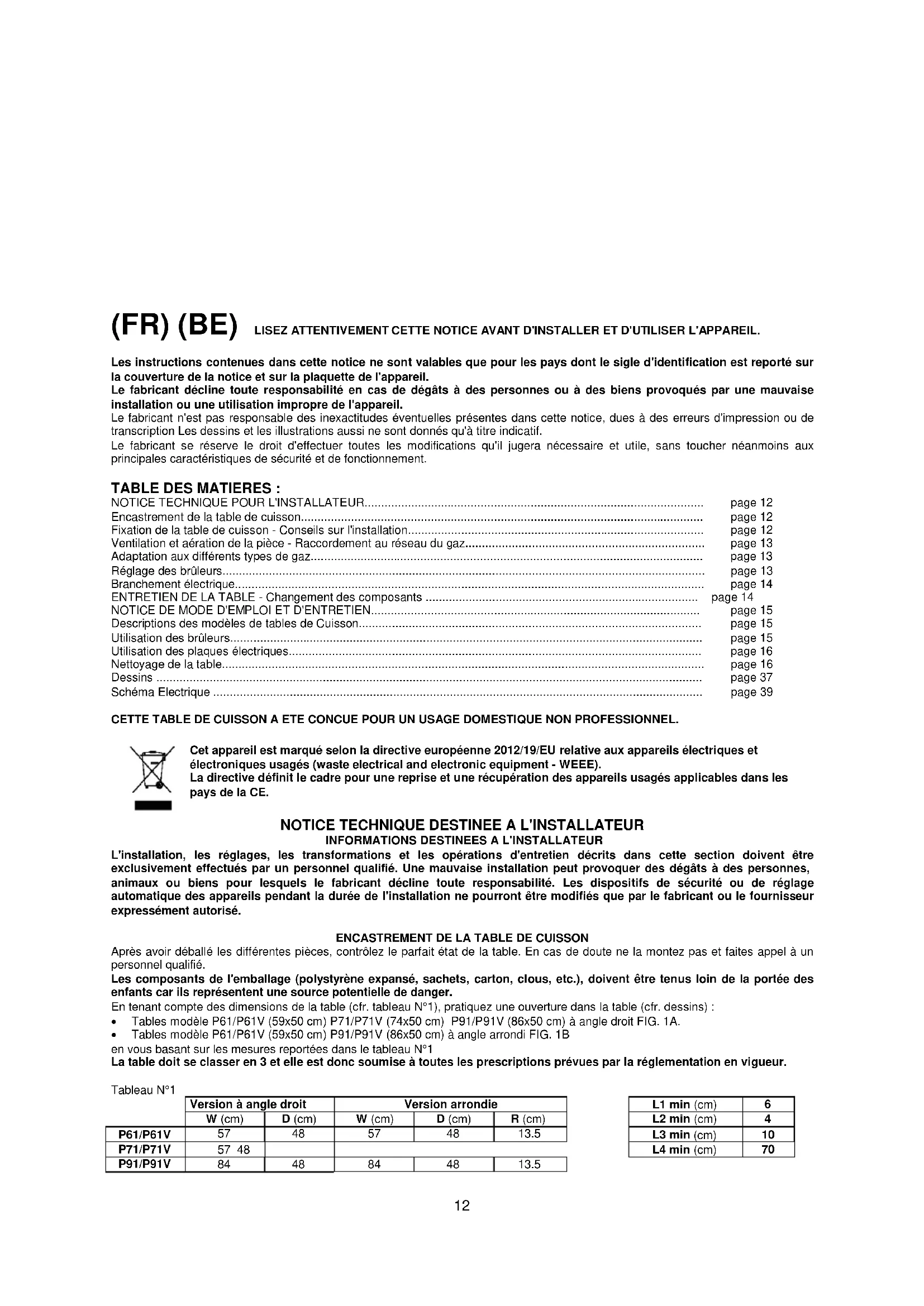 NOTICE TECHNIQUE POUR L'INSTALLATEUR. Encastrement de la table de cuisson. page 12 Fixation de la table de cuisson - Conseils sur l'installation. page 12 Ventilation et aération de la pièce - Raccordement au réseau du gaz. page 13 Adaptation aux différents types de gaz. page 13 Réglage des brûleurs. page 13 Branchement électrique page 14 ENTRETIEN DE LA TABLE - Changement des composants page 14 NOTICE DE MODE D'EMPLOI ET D'ENTRETIEN. page 15 Descriptions des modèles de tables de Cuisson. page 15 Utilisation des brûleurs. page 15 Utilisation des plaques électriques. page 16 Nettoyage de la table. page 16 Dessins page 37 Schéma électrique page 39