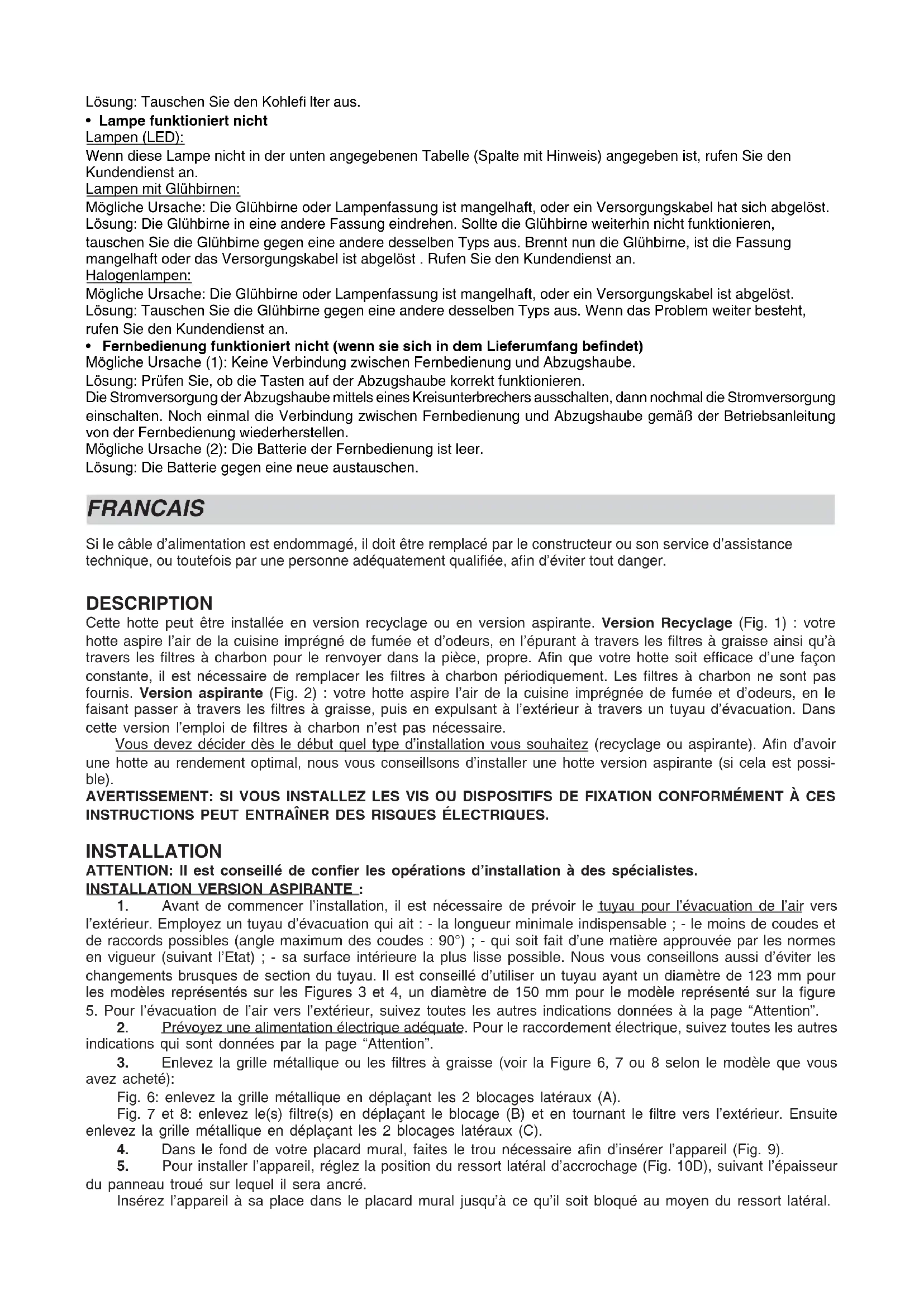 Cette hotte peut être installée en version recyclage ou en version aspirante. Version Recyclage (Fig. 1) : votre hotte aspire l'air de la cuisine imprégné de fumée et d'odeurs, en l'épurant à travers les filtres à graisse ainsi qu'à travers les filtres à charbon pour le renvoyer dans la pièce, propre. Afin que votre hotte soit efficace d'une façon constante, il est nécessaire de remplacer les filtres à charbon périodiquement. Les filtres à charbon ne sont pas fournis. Version aspirante (Fig. 2) : votre hotte aspire l'air de la cuisine imprégnée de fumée et d'odeurs, en le faisant passer à travers les filtres à graisse, puis en expulsant à l'extérieur à travers un tuyau d'évacuation. Dans cette version l'emploi de filtres à charbon n'est pas nécessaire.