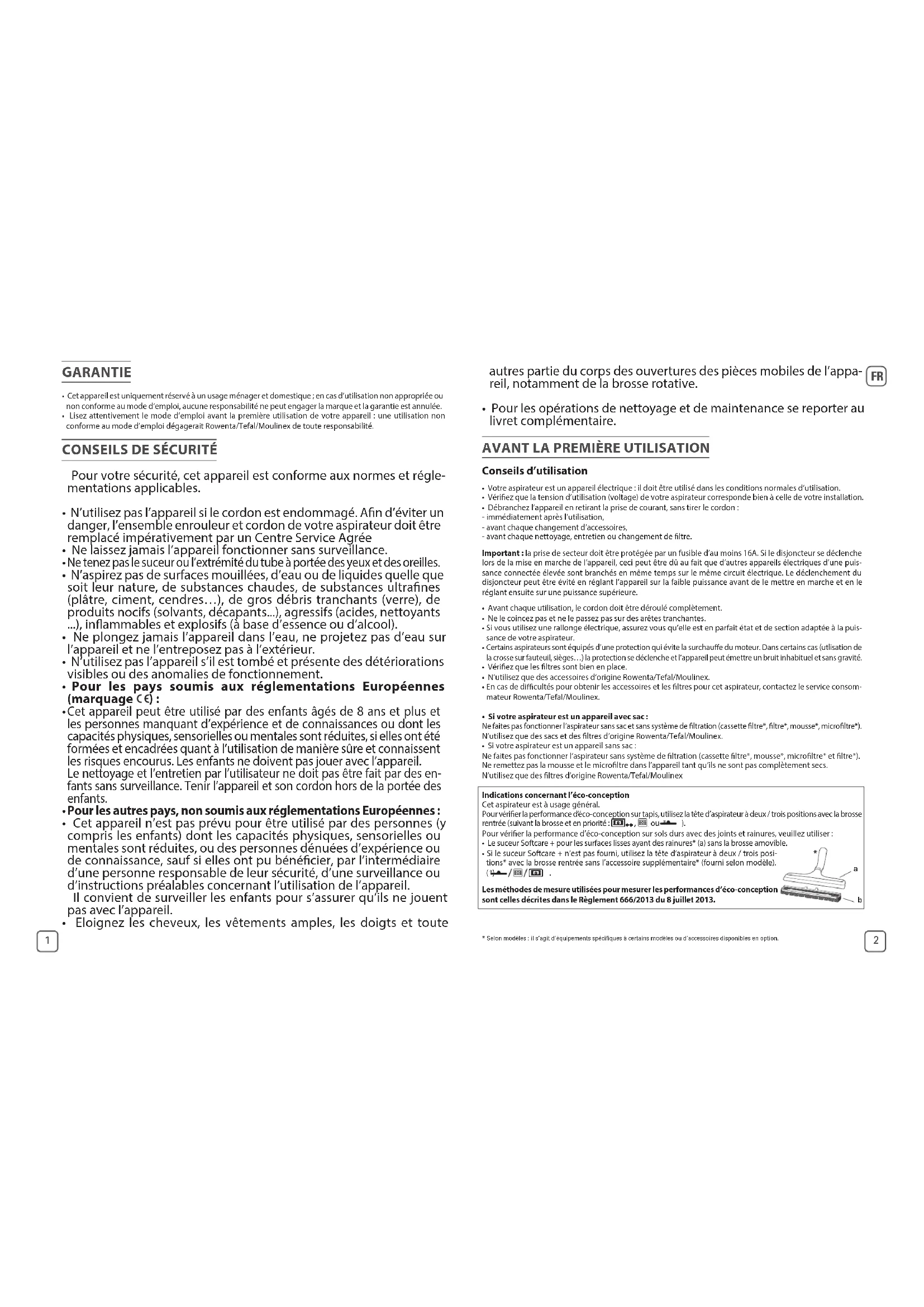 - En cas de dicultés pour obtenir les accessoires et les ltres pour cet aspirateur, contactez le service consom- mateur Rowenta/Tefal/Moulinex. • Si votre aspirateur est un appareil avec sac : Ne faites pas fonctionner l’aspirateur sans sac et sans système de ltration (cassette ltre*, ltre*, mousse*, microltre*). N’utilisez que des sacs et des ltres d’origine Rowenta/Tefal/Moulinex. • Si votre aspirateur est un appareil sans sac :Ne faites pas fonctionner l’aspirateur sans système de ltration (cassette ltre*, mousse*, microltre* et ltre*).Ne remettez pas la mousse et le microltre dans l’appareil tant qu’ils ne sont pas complètement secs.N’utilisez que des ltres d’origine Rowenta/Tefal/Moulinex Indications concernant l’éco-conceptionCet aspirateur est à usage général. Pour vérier la performance d’éco-conception sur tapis, utilisez la tête d’aspirateur à deux / trois positions avec la brosse rentrée (suivant la brosse et en priorité :