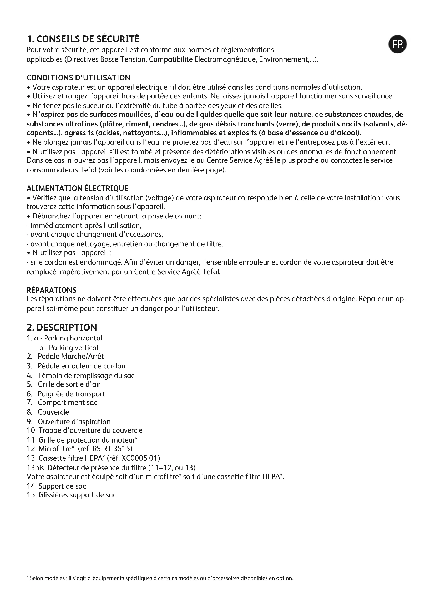 - Le cordon est ralenti lors de sa rentrée : ressortez le cordon et appuyez sur la pédale enrouleur de cordon. Si un problème persiste, confiez votre aspirateur au Centre Service Agréé Tefal le plus proche. Consultez la liste des Cen- tres Service Agréés Tefal ou contactez le service consommateurs Tefal (voir les coordonnées en dernière page). FR* Selon modèles : il s’agit d’équipements spécifiques à certains modèles ou d’accessoires disponibles en option.