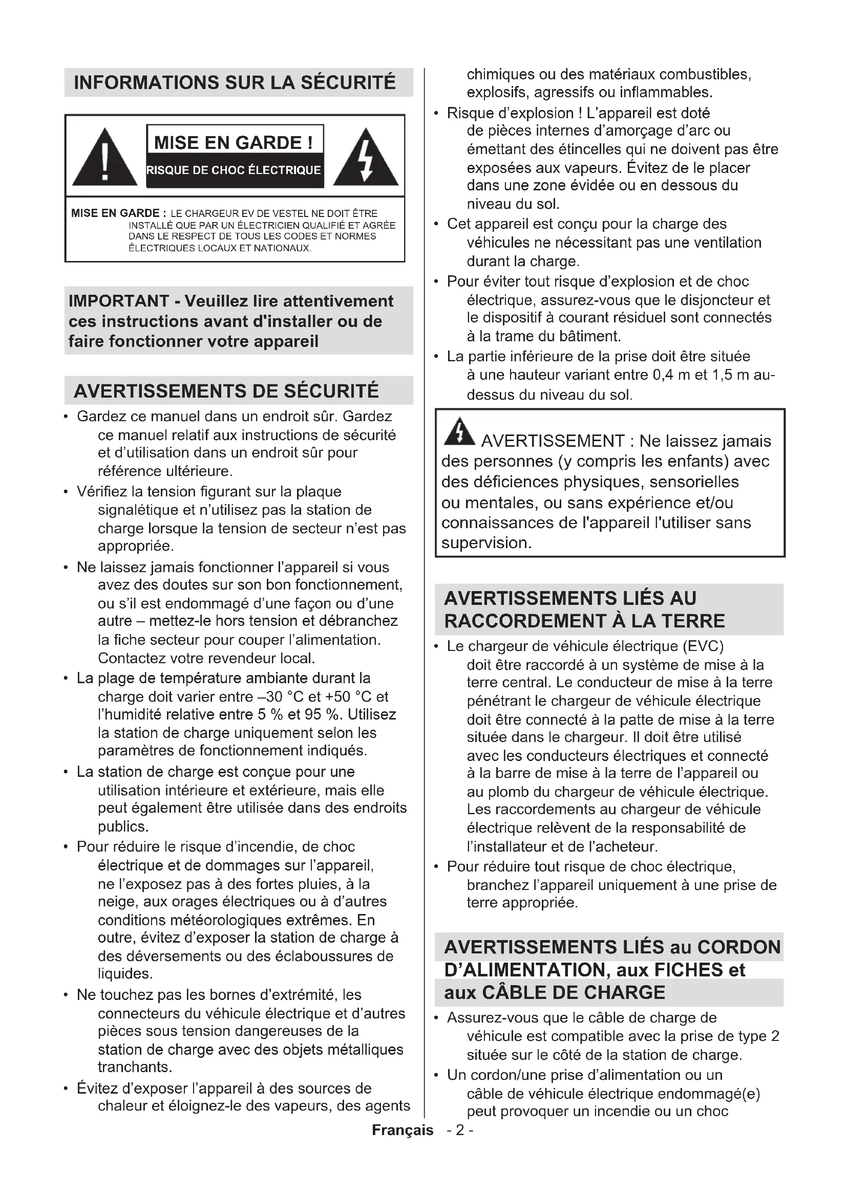 MISE EN GARDE ! RISQUE DE CHOC ÉLECTRIQUEMISE EN GARDE : LE CHARGEUR EV DE VESTEL NE DOIT ÊTRE INSTALLÉ QUE PAR UN ÉLECTRICIEN QUALIFIÉ ET AGRÉE DANS LE RESPECT DE TOUS LES CODES ET NORMES ÉLECTRIQUES LOCAUX ET NATIONAUX. IMPORTANT - Veuillez lire attentivement ces instructions avant d'installer ou de faire fonctionner votre appareil