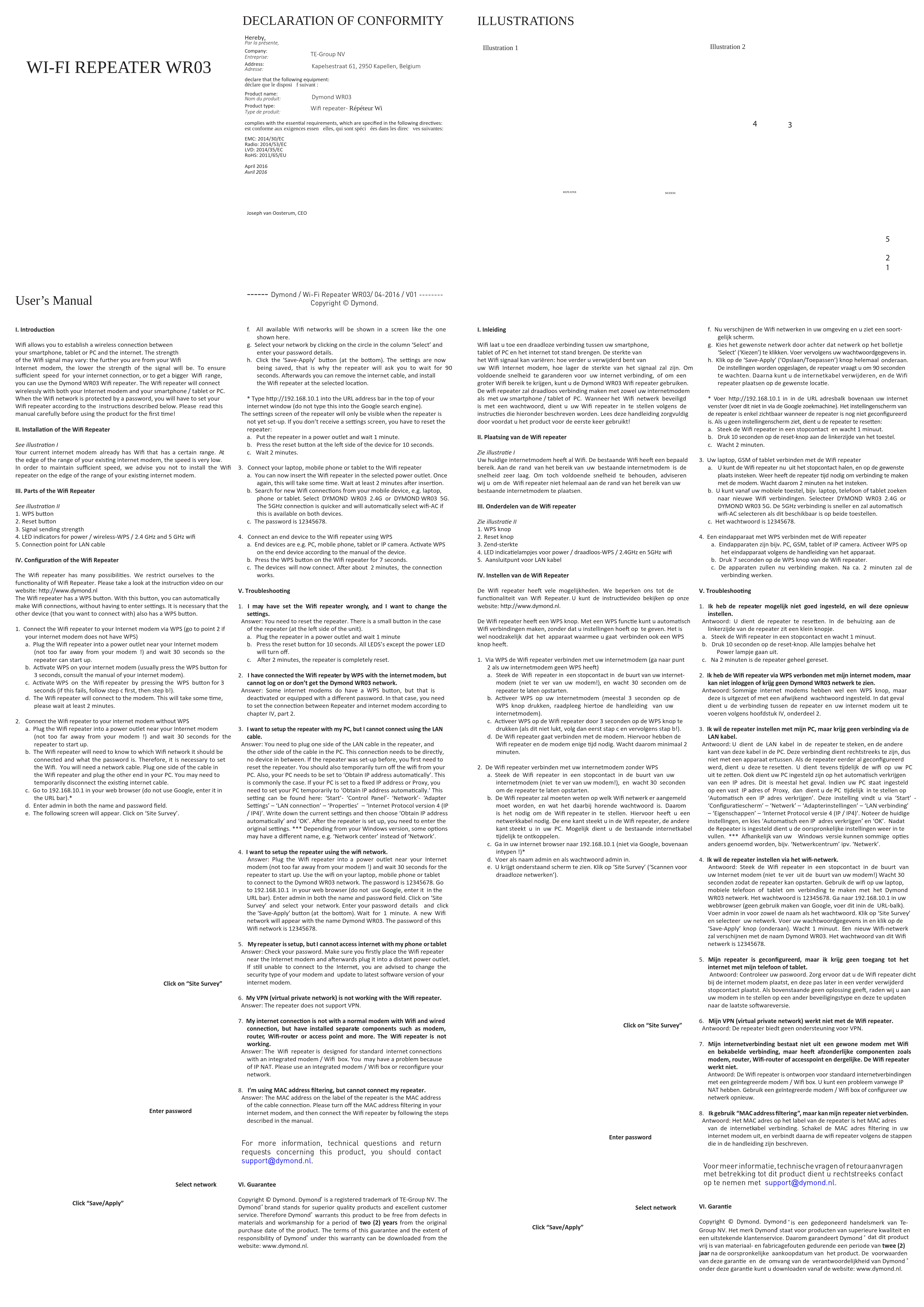 onder deze garane kunt u downloaden vanaf de website: www.dymond.nl.TE-Group NVKapelsestraat 61, 2950 Kapellen, BelgiumDymond WR03Wi repeater - Répéteur WiJoseph van Oosterum, CEOClick on “Site Survey”Select networkEnter passwordClick “Save/Apply”Click on “Site Survey”Select networkEnter passwordClick “Save/Apply” REPEATER MODEMI. Introducon Wi vous permet d’établir une connexion sans l entre votre smartphone, tablee ou PC et l’Internet. La force du signal Wi peut varier: Le plus vous êtes éloigné de votre modem Internet Wi, plus la puissance du signal devient lente. Pour assurer une vitesse susante pour votre connexion Internet, ou pour obtenir une plus grande portée, vous pouvez uliser le répéteur Wi Dymond WR03. Le répéteur Wi se connecte sans l à votre modem Internet et en même temps à votre smartphone / tablee ou PC. Lorsque le réseau Wi est protégé par un mot de passe, vous devrez congurer votre répéteur Wi selon les instrucons décrites ci-dessous. Veuillez lire aenvement ce manuel avant d’uliser le produit pour la première fois!