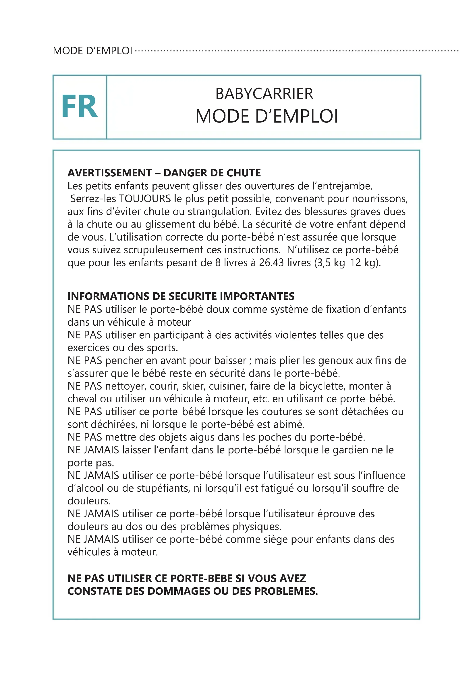 NE PAS UTILISER CE PORTE-BEBE SI VOUS AVEZ CONSTATE DES DOMMAGES OU DES PROBLEMES.
