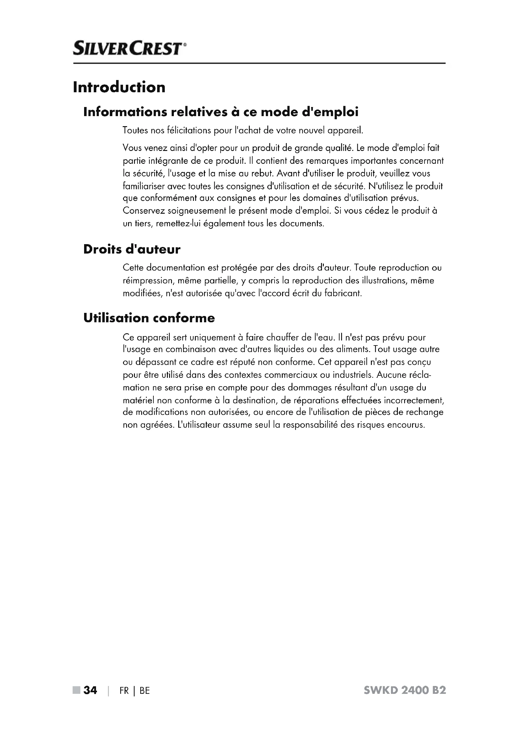 - GERMANY www.kompernass.comFR│BE │ 33 ■ SWKD 2400 B2 Table des matières Introduction p. 34