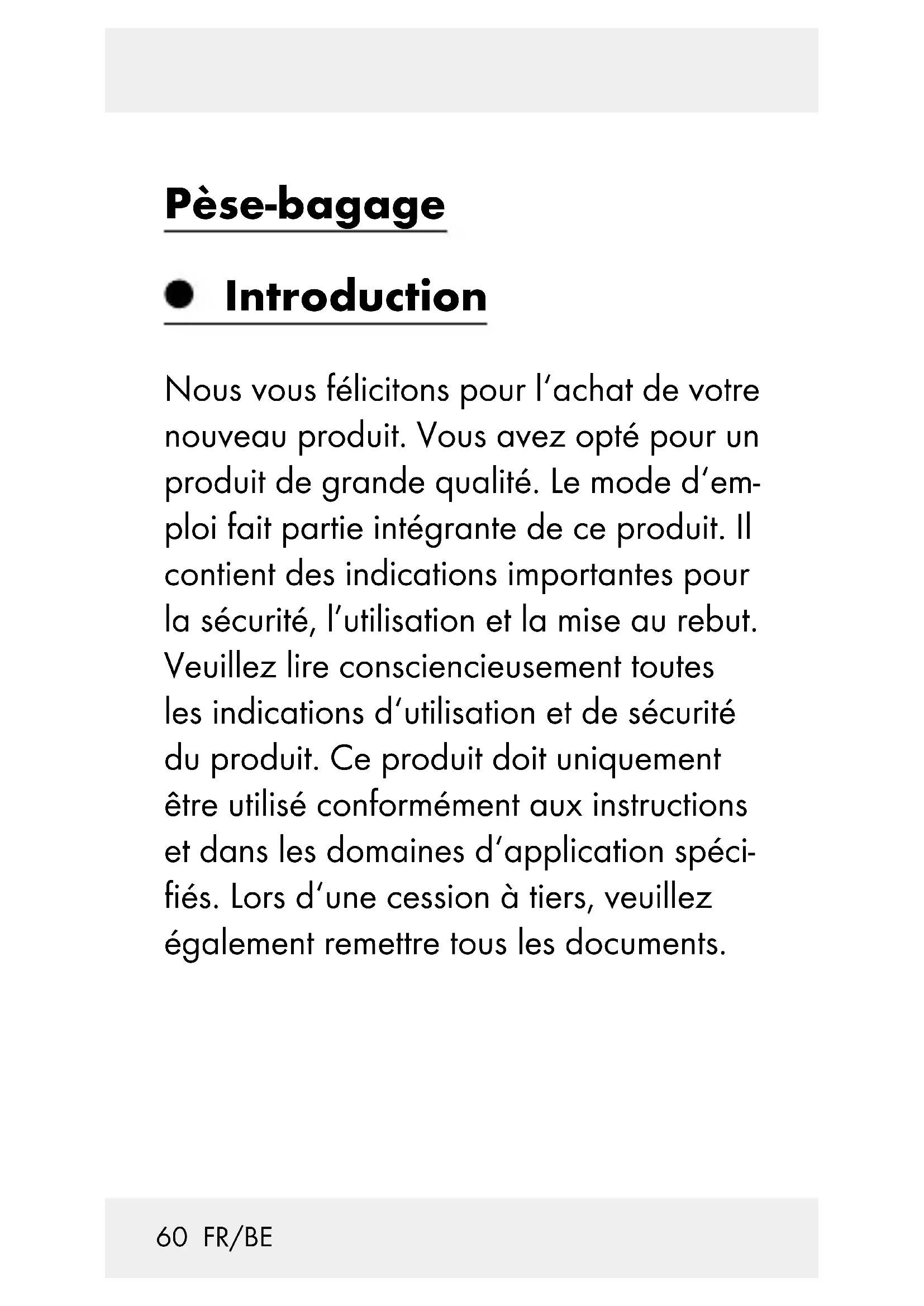 Compartiment à pile Caractéristiques techniques Plage de mesure : 0,2 kg–50 kg (0,5 lb–110 lb) Graduation: 0,05 kg (0,1 lb) Pile : 1 x 3 V (cou- rant continu), pile bouton (de type CR2032) Capacité de charge : 50 kg Contenu de la livraison Immédiatement après le déballage, veuillez contrôler que le contenu de la livraison est au complet et que le produit et toutes les pièces sont en parfait état.63 FR/BE N’assemblez en aucun cas le produit lorsque le contenu livré n’est pas complet. 1 pèse-bagages 1 pile 1 mode d‘emploi Consignes de sécurité