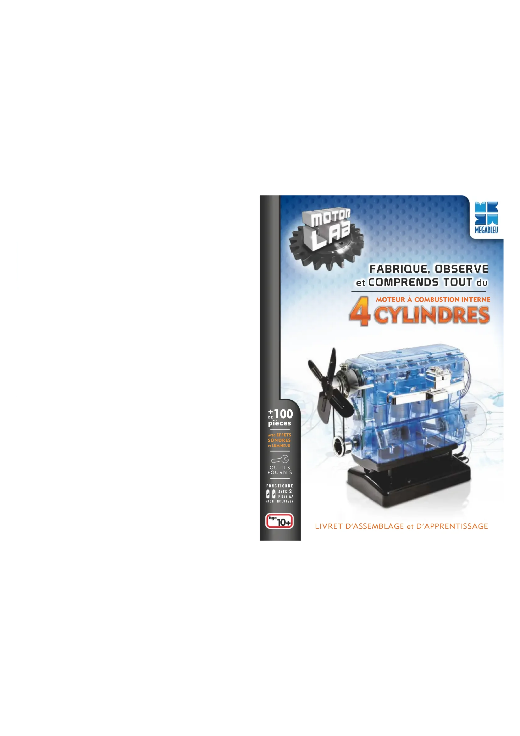 Le moteur que vous allez commencer à construire est une version très simplifiée d'un véritable moteur de voiture. Ce modèle est conçu pour être amusant à assembler et pour vous simplifier la compréhension du fonctionnement d'un moteur à quatre temps de taille réelle. Pour simplifier les choses, les composants suivants qui équipent un moteur de taille réelle ne figurent pas sur le modèle : filtre à huile, système de refroidissement, filtre à air, coussinets de bielle, segments de piston, pompe à huile, alternateur et démarreur (un module d'entraînement, propulsé par un petit moteur électrique, est présent à la place du démarreur).