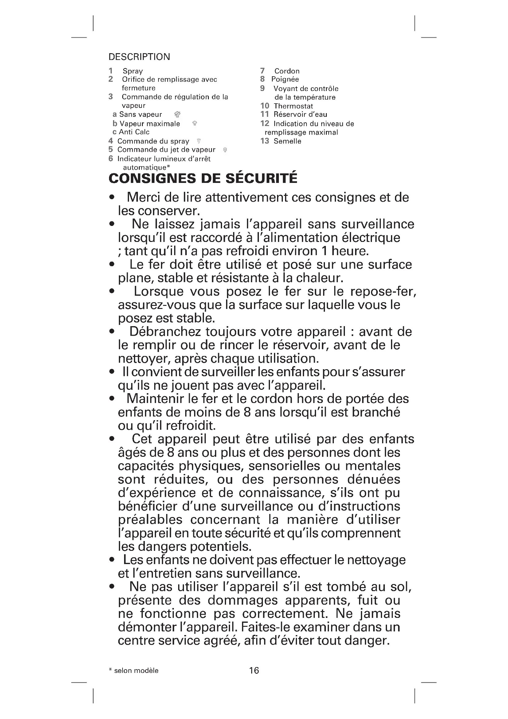 - Ne pas utiliser l’appareil s’il est tombé au sol, présente des dommages apparents, fuit ou ne fonctionne pas correctement. Ne jamais démonter l’appareil. Faites-le examiner dans un centre service agréé, afin d’éviter tout danger. 1 Spray 2 Orifice de remplissage avec fermeture 3 Commande de régulation de la vapeur a Sans vapeur b Vapeur maximale c Anti Calc 4 Commande du spray 5 Commande du jet de vapeur 6 Indicateur lumineux d’arrêt automatique* 7 Cordon 8 Poignée 9 Voyant de contrôle de la température 10 Thermostat 11 Réservoir d’eau 12 Indication du niveau de remplissage maximal 13 Semelle DESCRIPTION17