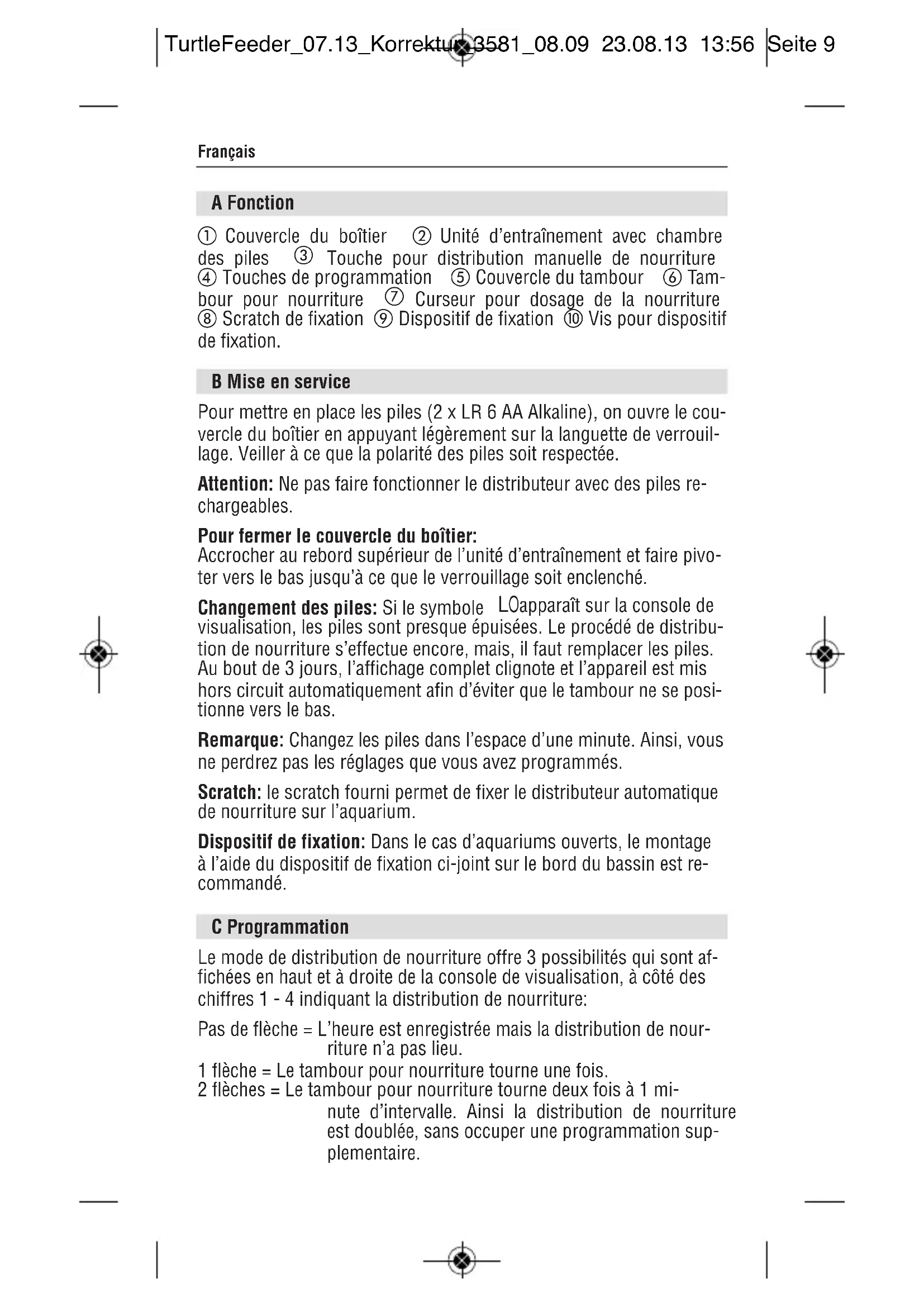Vis pour dispositif de fixation. Pour mettre en place les piles (2 x LR 6 AA Alkaline), on ouvre le cou- vercle du boîtier en appuyant légèrement sur la languette de verrouil- lage. Veiller à ce que la polarité des piles soit respectée. Attention: Ne pas faire fonctionner le distributeur avec des piles re- chargeables. Pour fermer le couvercle du boîtier: Accrocher au rebord supérieur de l’unité d’entraînement et faire pivo- ter vers le bas jusqu’à ce que le verrouillage soit enclenché. Changement des piles: Si le symbole LO apparaît sur la console de visualisation, les piles sont presque épuisées. Le procédé de distribu- tion de nourriture s’effectue encore, mais, il faut remplacer les piles. Au bout de 3 jours, l’affichage complet clignote et l’appareil est mis hors circuit automatiquement afin d’éviter que le tambour ne se posi- tionne vers le bas. Remarque: Changez les piles dans l’espace d’une minute. Ainsi, vous ne perdrez pas les réglages que vous avez programmés. Scratch: le scratch fourni permet de fixer le distributeur automatique de nourriture sur l’aquarium. Dispositif de fixation: Dans le cas d’aquariums ouverts, le montage à l’aide du dispositif de fixation ci-joint sur le bord du bassin est re- commandé. B Mise en service Le mode de distribution de nourriture offre 3 possibilités qui sont af- fichées en haut et à droite de la console de visualisation, à côté des chiffres 1 - 4 indiquant la distribution de nourriture: Pas de flèche = L’heure est enregistrée mais la distribution de nour- riture n’a pas lieu. 1 flèche = Le tambour pour nourriture tourne une fois. 2 flèches = Le tambour pour nourriture tourne deux fois à 1 mi- nute d’intervalle. Ainsi la distribution de nourriture est doublée, sans occuper une programmation sup- plementaire. C Programmation TurtleFeeder_07.13_Korrektur_3581_08.09 23.08.13 13:56 Seite 9Règles générales de programmation: MODE commute tour à tour entre l’heure actuelle et les heures de distribution de nourriture de 1 à 4. On reconnaît l’heure aux deux points clignotants; les heures de distribution de nourriture sont dif- férenciées par les chiffres qui se trouvent dans la partie supérieure de la console de visualisation. Le fait de pousser la touche SET permet d’intervenir sur une pro- grammation.Par pressions successives de la touche MODE on selec- tionne si l’on intervient sur les heures, les minutes ou la distribution de nourriture. La section sur laquelle on peut intervenir clignotte alors, et on peut la modifier à l’aide de la touche „+“. Lorsque la programmation est réalisée il faut pousser de nouveau la touche SET pour qu’elle soit mémorisée. Exemple: Une fois que les piles sont en place, l’heure 00:00 est affichée les deux points clignotent au rythme des secondes. Pour régler l’heure: SET > Les heures clignotent et sont réglées à l’aide de + . MODE > Les minutes clignotent et sont réglées à l’aide de + . SET > L’heure est enregistrée. Programmation de l’heure de distribution de nourriture 1: MODE > L’heure de distribution est représentée dans la partie su- périeure par 00:00 et le chiffre 1. SET > Les heures clignotent et sont réglées à l’aide de + . MODE > Les minutes clignotent et sont réglées à l’aide de + . MODE > Le chiffre 1 clignote, le mode de distribution de nourri- ture doit être réglé à l’aide de + , une ou deux flêches apparaissent.