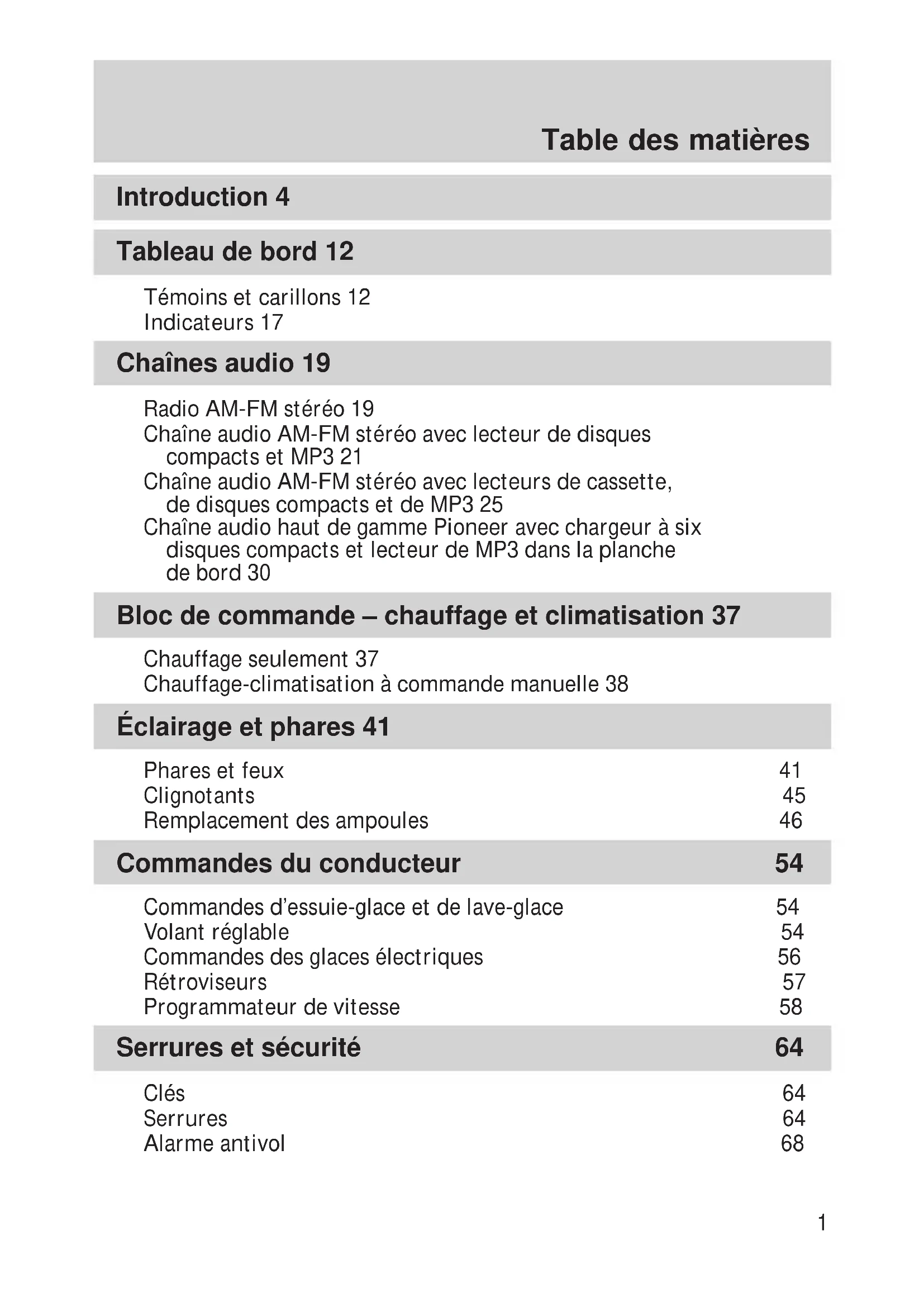 Introduction 4 Tableau de bord 12 Témoins et carillons 12 Indicateurs 17 Chaînes audio 19 Radio AM-FM stéréo 19 Chaîne audio AM-FM stéréo avec lecteur de disques compacts et MP3 21 Chaîne audio AM-FM stéréo avec lecteurs de cassette, de disques compacts et de MP3 25 Chaîne audio haut de gamme Pioneer avec chargeur à six disques compacts et lecteur de MP3 dans la planche de bord 30 Bloc de commande – chauffage et climatisation 37 Chauffage seulement 37 Chauffage-climatisation à commande manuelle 38 Éclairage et phares 41 Phares et feux 41 Clignotants 45 Remplacement des ampoules 46 Commandes du conducteur 54 Commandes d’essuie-glace et de lave-glace 54 Volant réglable 54 Commandes des glaces électriques 56 Rétroviseurs 57 Programmateur de vitesse 58 Serrures et sécurité 64 Clés 64 Serrures 64 Alarme antivol 68 Table des matières