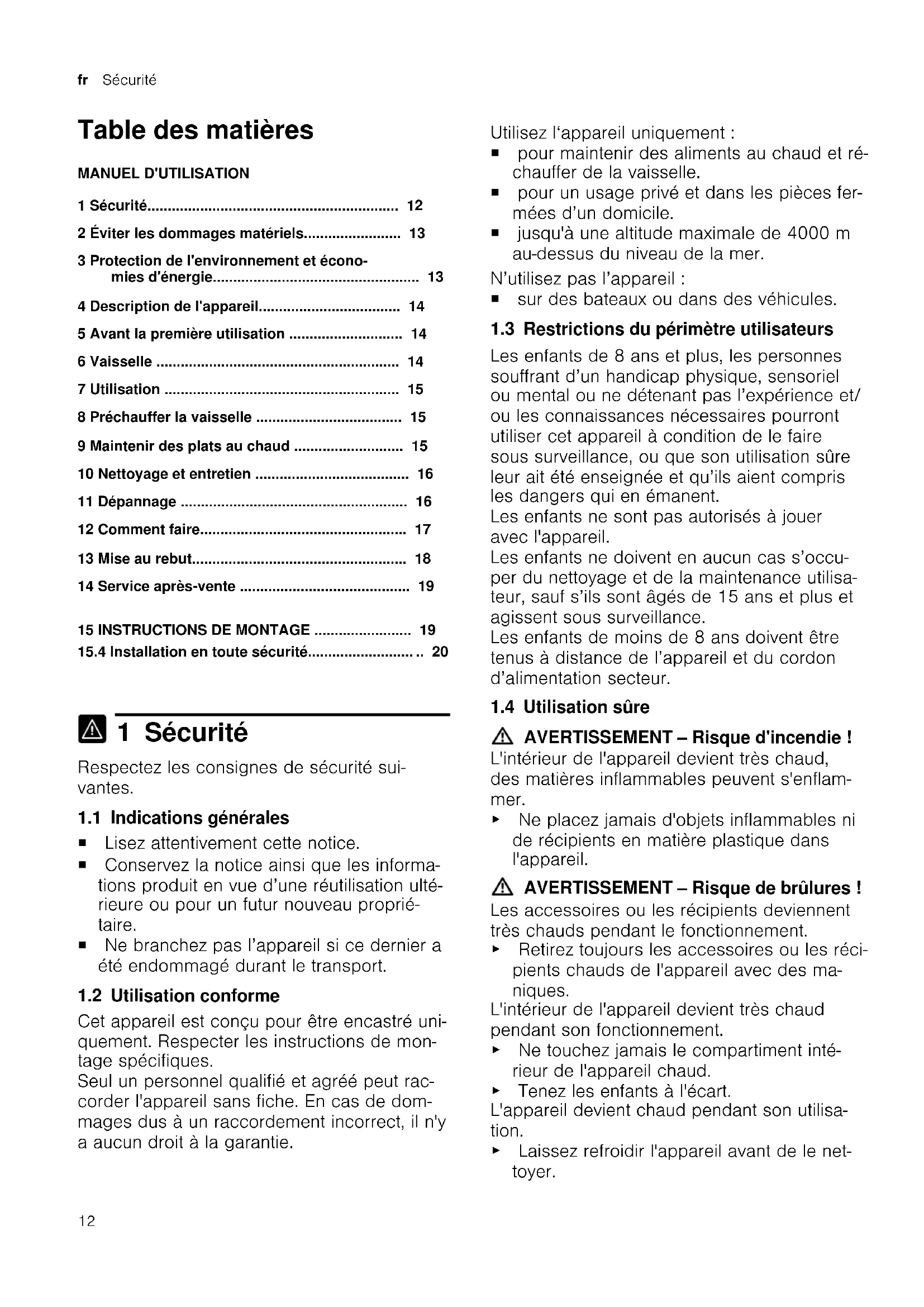 1 Sécurité Respectez les consignes de sécurité sui- vantes. 1.1 Indications générales ¡ Lisez attentivement cette notice. ¡ Conservez la notice ainsi que les informa- tions produit en vue d’une réutilisation ulté- rieure ou pour un futur nouveau proprié- taire. ¡ Ne branchez pas l’appareil si ce dernier a été endommagé durant le transport. 1.2 Utilisation conforme Cet appareil est conçu pour être encastré uni- quement. Respecter les instructions de mon- tage spécifiques. Seul un personnel qualifié et agréé peut rac- corder l'appareil sans fiche. En cas de dom- mages dus à un raccordement incorrect, il n'y a aucun droit à la garantie. Utilisez l‘appareil uniquement: ¡ pour maintenir des aliments au chaud et ré- chauffer de la vaisselle. ¡ pour un usage privé et dans les pièces fer- mées d’un domicile. ¡ jusqu'à une altitude maximale de 4000m au-dessus du niveau de la mer. N’utilisez pas l’appareil: ¡ sur des bateaux ou dans des véhicules. 1.3 Restrictions du périmètre utilisateurs Les enfants de 8 ans et plus, les personnes souffrant d’un handicap physique, sensoriel ou mental ou ne détenant pas l’expérience et/ ou les connaissances nécessaires pourront utiliser cet appareil à condition de le faire sous surveillance, ou que son utilisation sûre leur ait été enseignée et qu’ils aient compris les dangers qui en émanent. Les enfants ne sont pas autorisés à jouer avec l'appareil. Les enfants ne doivent en aucun cas s’occu- per du nettoyage et de la maintenance utilisa- teur, sauf s’ils sont âgés de 15ans et plus et agissent sous surveillance. Les enfants de moins de 8ans doivent être tenus à distance de l’appareil et du cordon d’alimentation secteur. 1.4 Utilisation sûre AVERTISSEMENT‒Risque d'incendie! L'intérieur de l'appareil devient très chaud, des matières inflammables peuvent s'enflam- mer. ▶ Ne placez jamais d'objets inflammables ni de récipients en matière plastique dans l'appareil. AVERTISSEMENT‒Risque de brûlures! Les accessoires ou les récipients deviennent très chauds pendant le fonctionnement. ▶ Retirez toujours les accessoires ou les réci- pients chauds de l'appareil avec des ma- niques. L'intérieur de l'appareil devient très chaud pendant son fonctionnement. ▶ Ne touchez jamais le compartiment inté- rieur de l'appareil chaud. ▶ Tenez les enfants à l'écart. L'appareil devient chaud pendant son utilisa- tion. ▶ Laissez refroidir l'appareil avant de le net- toyer.Éviter les dommages matériels fr