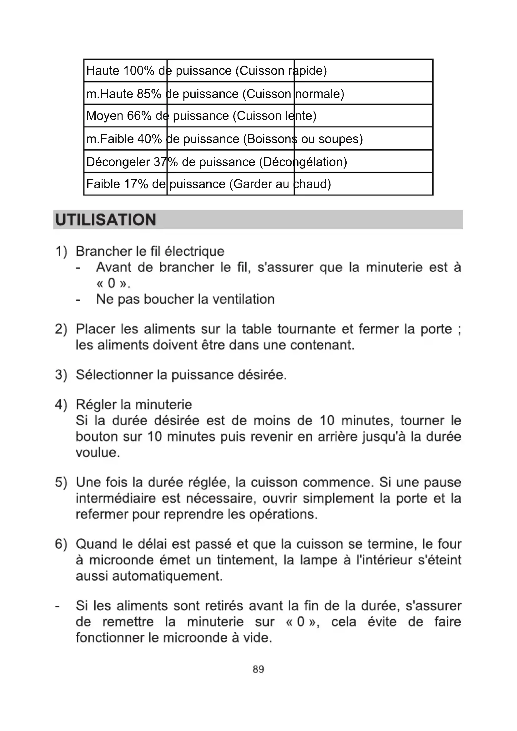 2) Placer les aliments sur la table tournante et fermer la porte ; les aliments doivent être dans un contenant. 3) Sélectionner la puissance désirée. 4) Régler la minuterie.
