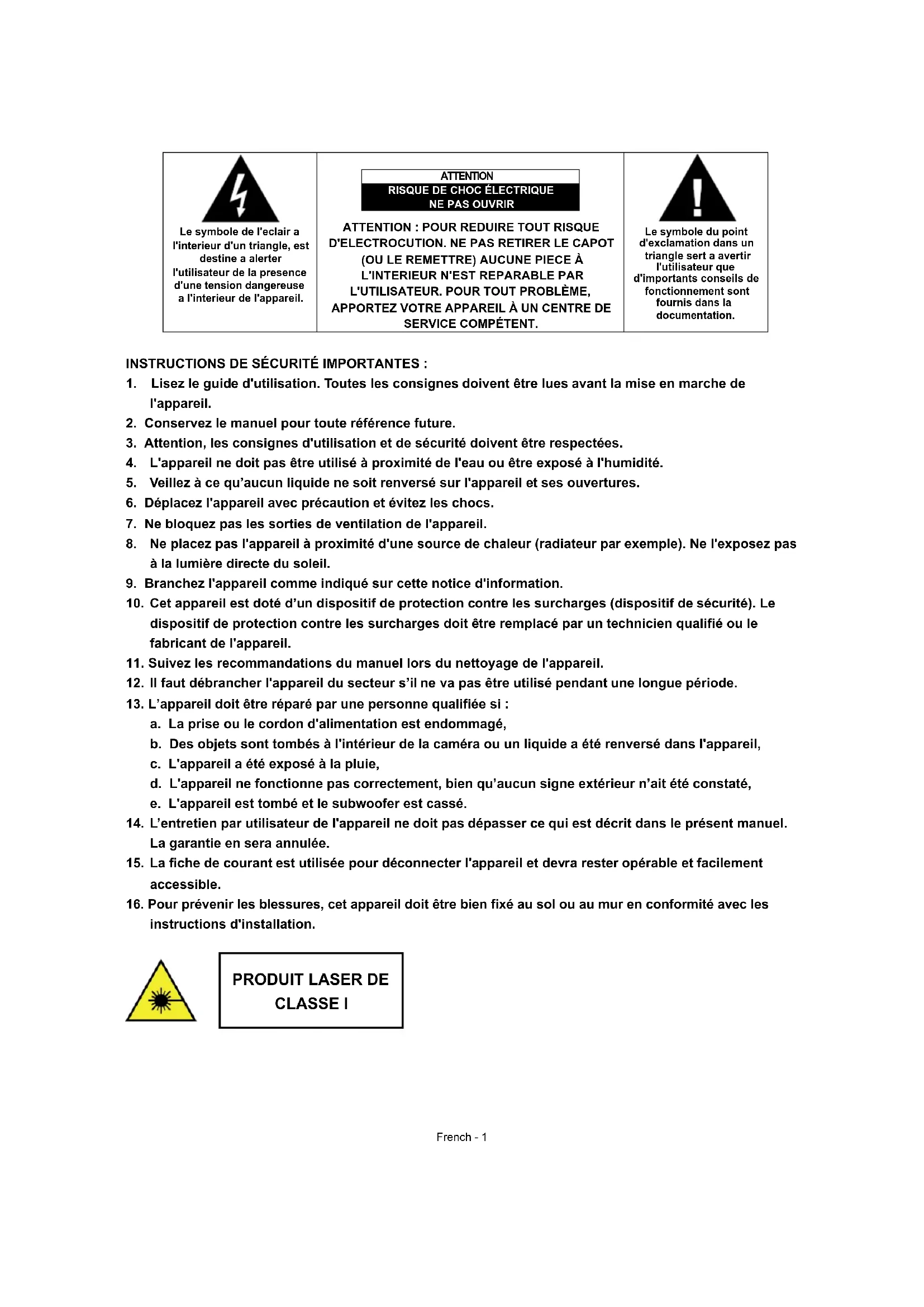a. La prise ou le cordon d'alimentation est endommagé, b. Des objets sont tombés à l'intérieur de la caméra ou un liquide a été renversé dans l'appareil, c. L'appareil a été exposé à la pluie, d. L'appareil ne fonctionne pas correctement, bien qu’aucun signe extérieur n’ait été constaté, e. L'appareil est tombé et le subwoofer est cassé.