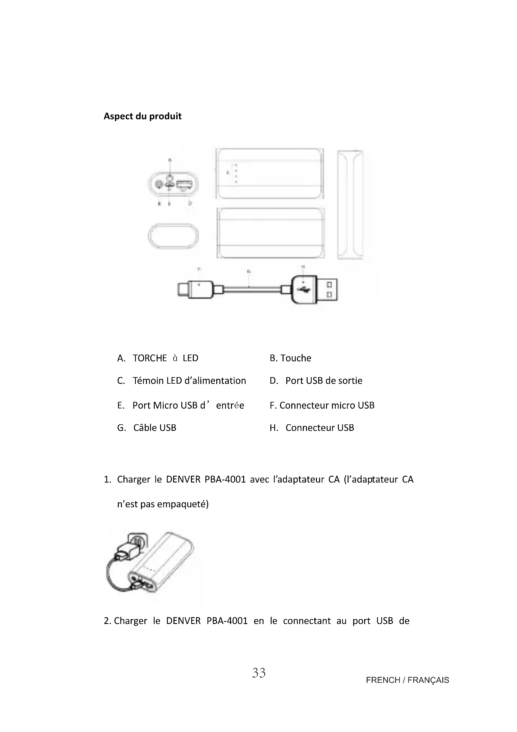 - Charger le DENVER PBA-4001 avec l'adaptateur CA (l'adaptateur CA n'est pas empaqueté)
