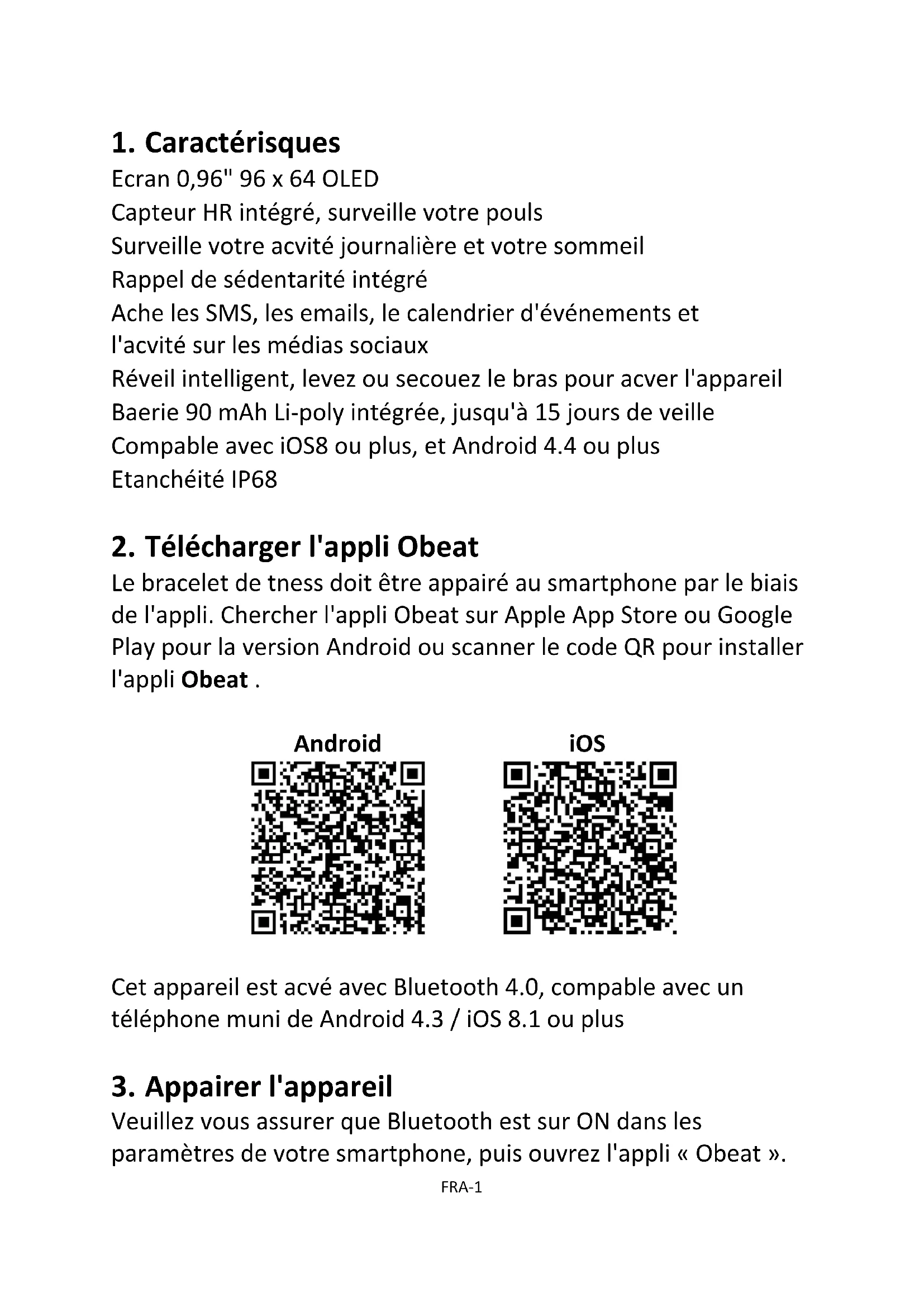 Le bracelet de fitness doit être appairé au smartphone par le biais de l'appli. Chercher l'appli Obeat sur Apple App Store ou Google Play pour la version Android ou scanner le code QR pour installer l'appli Obeat . Android iOS