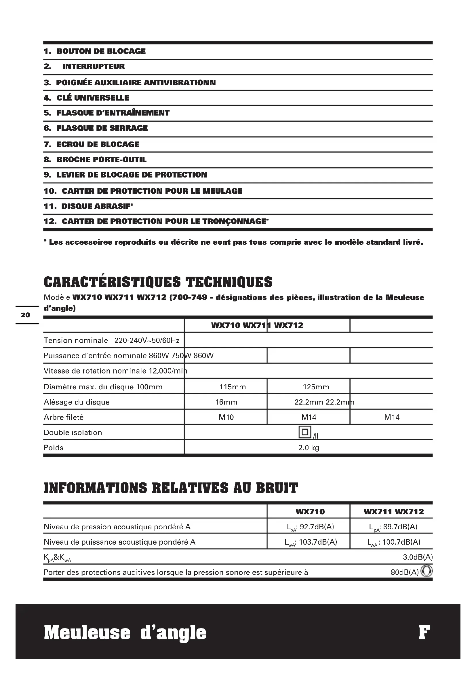 Planifiez votre travail pour étaler l’utilisation des outils à forte vibration sur plusieurs jours. ACCESSOIRES WX710 WX711 WX712 Disque 1 Disque de meulage des métaux 1 Poignée auxiliaire 1 1 / Poignée auxiliaire anti-vibrations / / 1 Nous recommandons d’acheter tous les accessoires dans le magasin d’acquisition de l’outil. Il est impératif d’utiliser des accessoires de bonne qualité et de marque connue et de choisir l’accessoire correct recommandé dans ce manuel. Pour plus d’informations, se référer à l’emballage des accessoires. Le personnel du magasin est également là pour vous conseiller.Meuleuse d’angle F