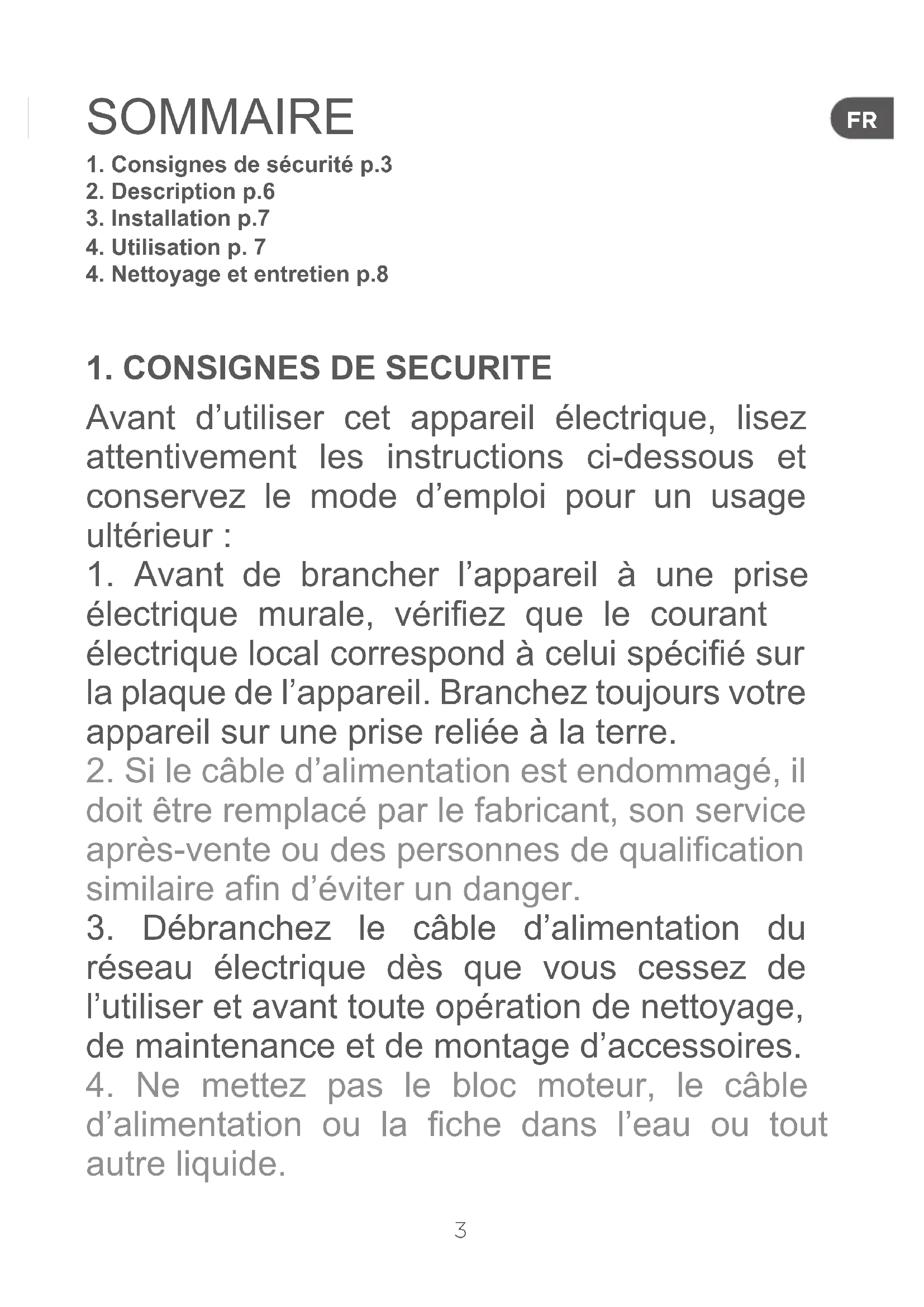 Avant d’utiliser cet appareil électrique, lisez attentivement les instructions ci-dessous et conservez le mode d’emploi pour un usage ultérieur :