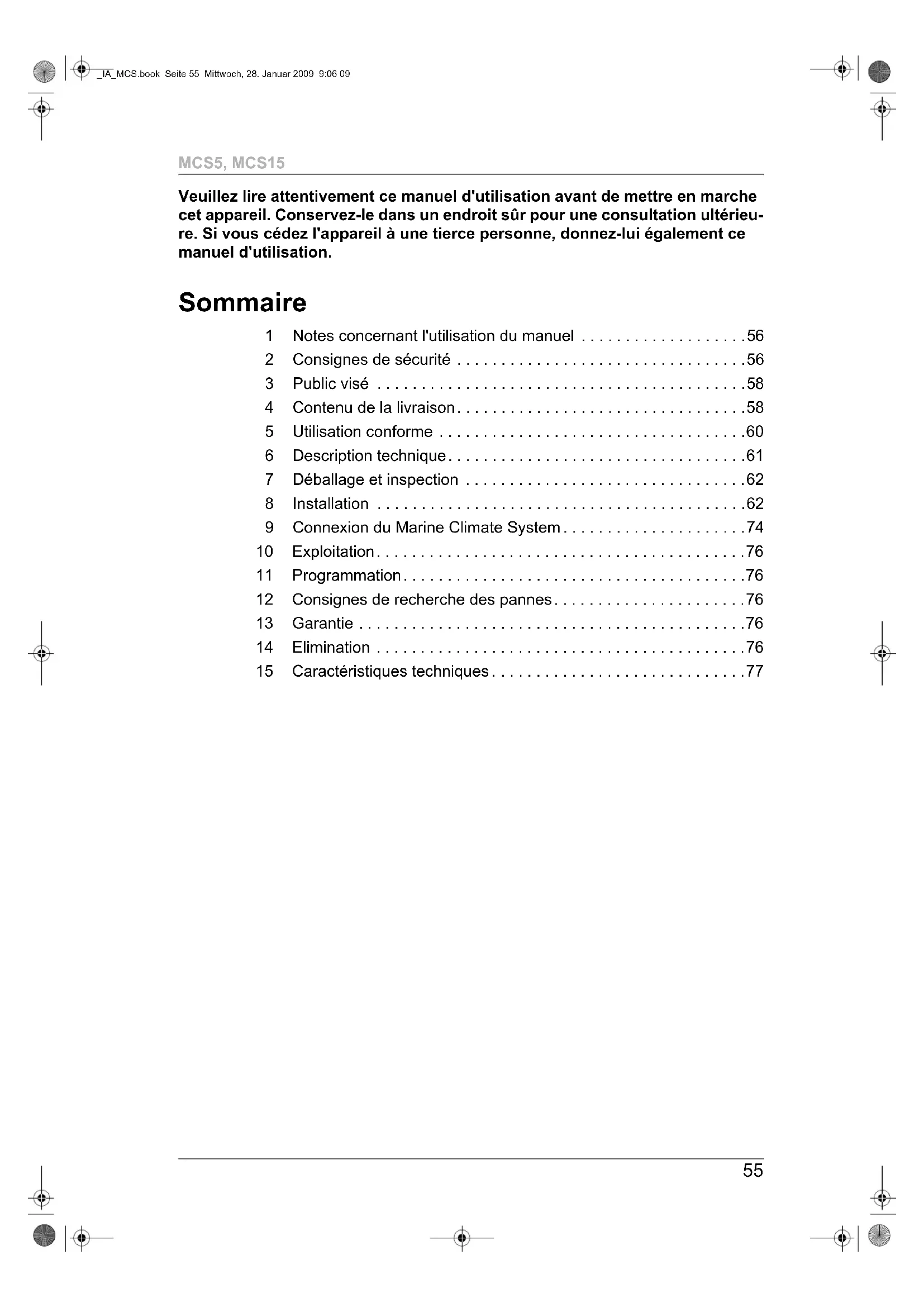 REMARQUES : La longueur maximale des câbles de l'écran et du capteur est 22,9 m. Le capteur d'air extérieur et les capteurs d'air auxiliaires sont des éléments optionnels et ne sont pas inclus dans le pack de commande standard. Sous réserve de modifications des versions, d'améliorations techniques et d'options de livraison. Marine Climate System MCS5 Marine Climate System MCS15Alimentation du système de refroidissement :5000 Btu/h1500 W15000 Btu/h4400 WTension d'entrée : 230 V 230 VConsommation de courant :Refroidissement : 2,2 A 5,7 AChauffage : 2,9 A 7,0 ADimensions (l x h x p) :Unité : 226 x 279 x 452 mm 226 x 279 x 452 mm Panneau de commande : 81 x 64 x 24 mm 81 x 64 x 24 mm Découpe du panneau : 64 x 48 mm 64 x 48 mm Poids : 18 kg 28 kgCâble de l'écran : 4,5 m standardCapteur d'air auxiliaire (en option) : 2,0 m standardCapteur d'air extérieur (en option) : 4,5 m standardToutes les longueurs de câbles spéciales sont fournies par incrément de 1,5 m standard :22,5 m maximum_IA_MCS.book Seite 77 Mittwoch, 28. Januar 2009 9:06 09MCS5, MCS15