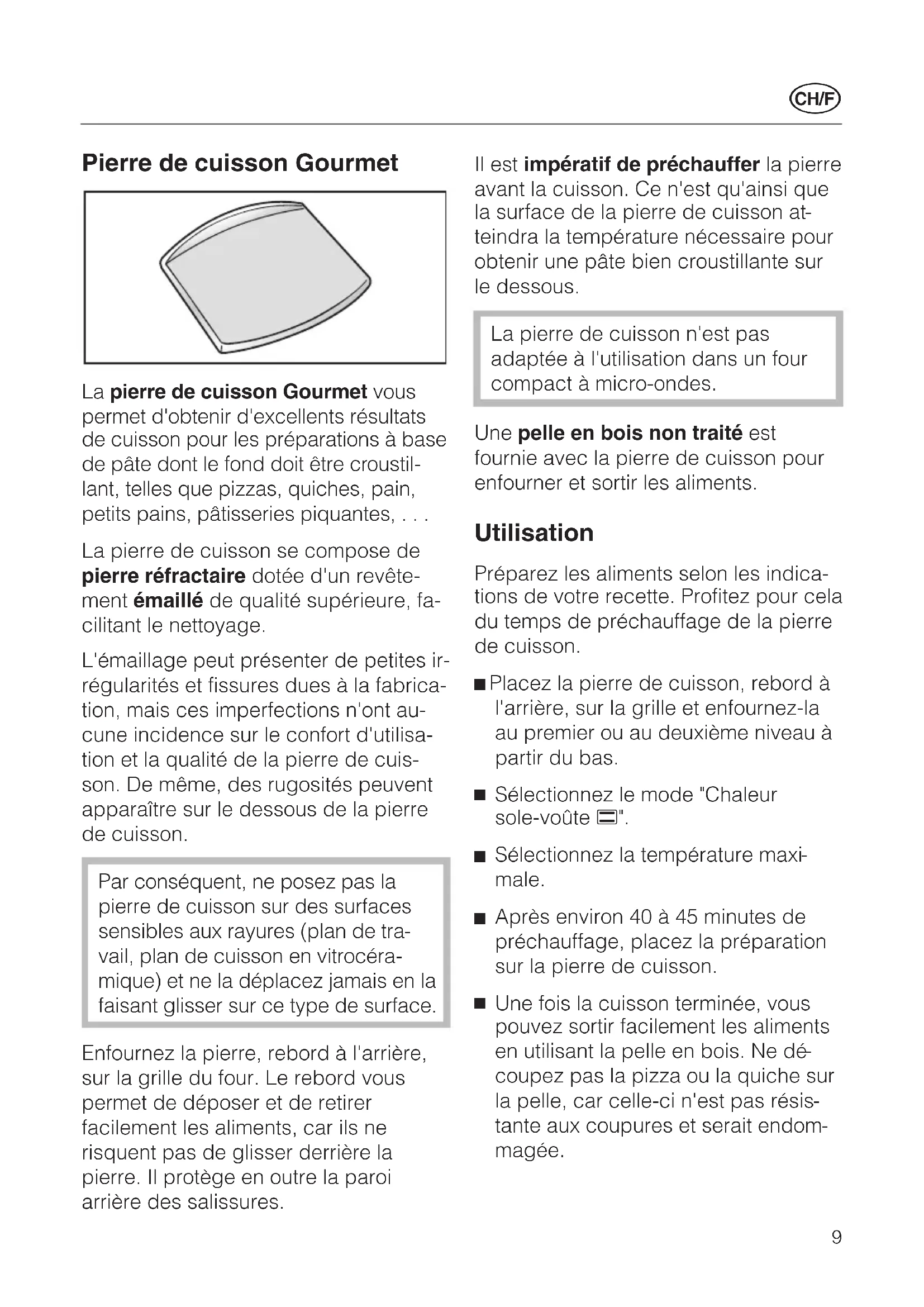 mique) et ne la déplacez jamais en la faisant glisser sur ce type de surface. Enfournez la pierre, rebord à l'arrière, sur la grille du four. Le rebord vous permet de déposer et de retirer facilement les aliments, car ils ne risquent pas de glisser derrière la pierre. Il protège en outre la paroi arrière des salissures. Il est impératif de préchauffer la pierre avant la cuisson. Ce n'est qu'ainsi que la surface de la pierre de cuisson at