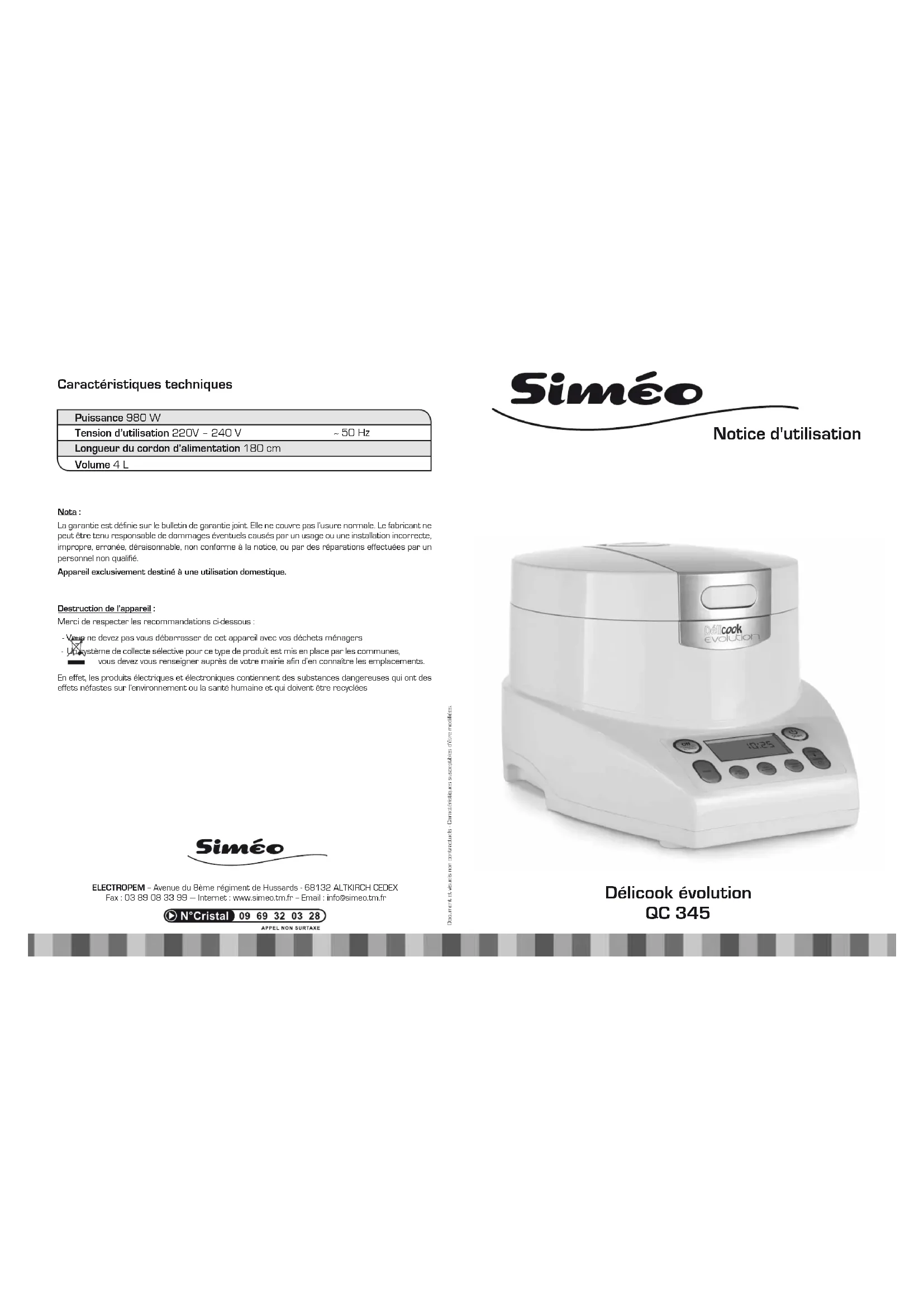 Retrouvez gratuitement la notice de l'appareil Délicook évolution QC 345 SIMEO au format PDF.