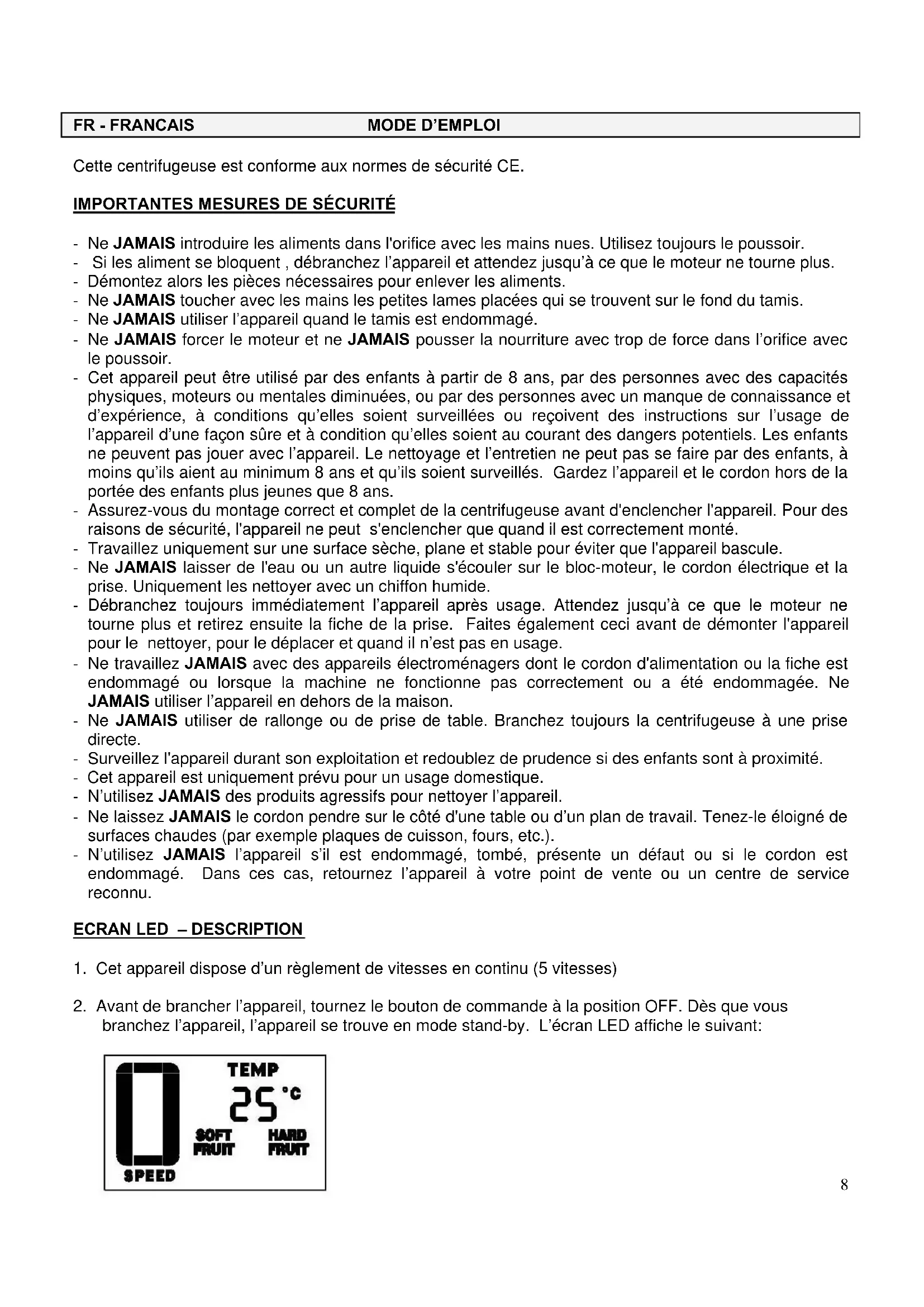 Félicitations! Vous venez d'acheter une superbe centrifugeuse qui transforme tous vos fruits et légumes en jus délieux. Lisez attentivement ce mode d'emploi, ainsi que les conditions de garantie avant l'utilisation. Conservez-les soignement. Des personnes, n'avant pas lu ce mode d'emploi, ne peuvent pas utiliser cette centrifugeuse.