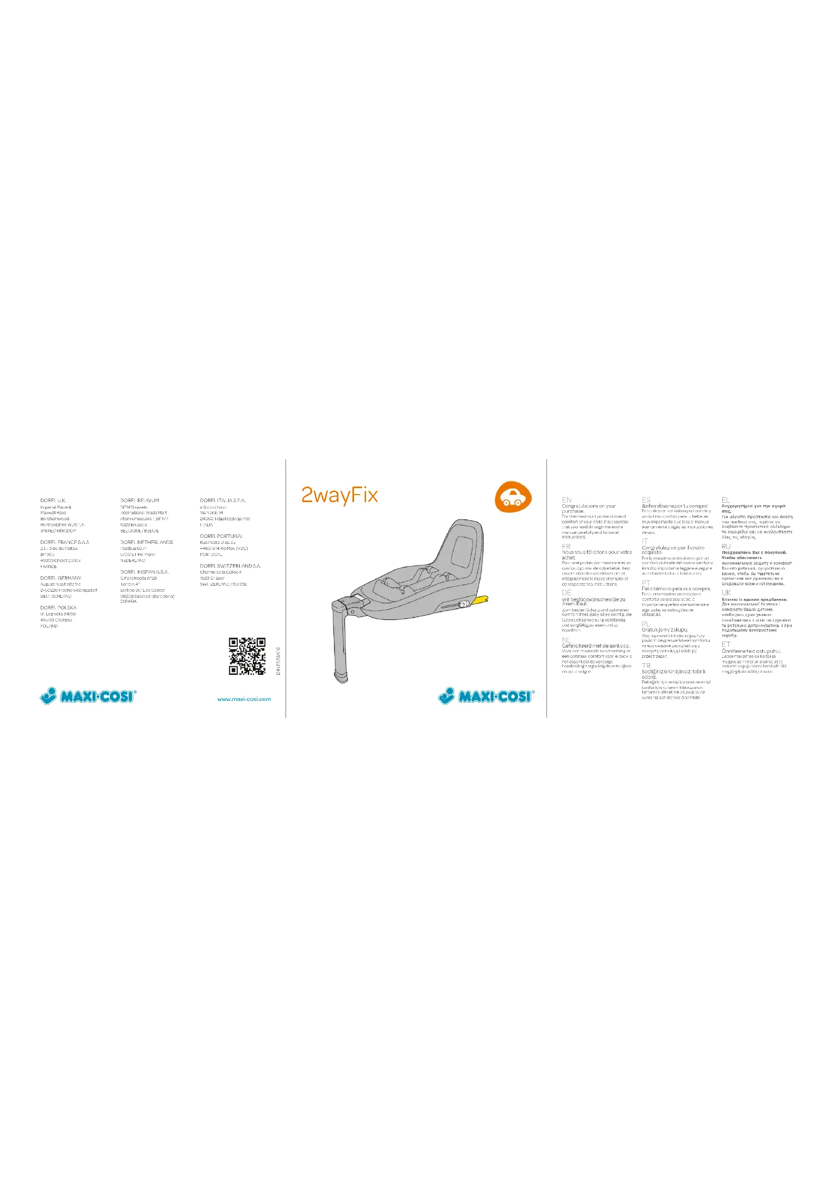 FRFR d’un entretien mené par une personne non autorisée par nos services, les produits volés, ne portant plus l’étiquette ou le numéro d’identification ou les produits dont ce numéro a été modifié. Des exemples d’usure normale comprennent : des roues et des tissus usés par l’utilisation régulière et la décoloration et la décomposition naturelle de couleurs et des matériaux dus à la vétusté du produit. Que faire en cas de défauts : Si des problèmes ou des défauts surviennent, le meilleur choix pour un service rapide est de consulter un revendeur agréé par nos services. Notre garantie de 24 mois est reconnue par ceux-ci (1) . Vous devez présenter la preuve d’un achat effectué dans les 24 mois précédant la demande de service. Cela est plus facile si vous obtenez l’approbation au préalable de votre demande auprès de nos services. Si vous soumettez une réclamation valide en vertu de cette garantie, nous pouvons vous demander de retourner votre produit au distributeur agréé ou de nous envoyer le produit conformément à nos instructions. Nous payerons les frais d’envoi et de retour si toutes les instructions sont correctement suivies. Les dommages et/ou défauts qui ne sont couverts ni par notre garantie ni par les droits légaux du consommateur et/ou les dommages et/ou défauts en rapport à des produits qui ne sont pas couverts par notre garantie peuvent être traités à un tarif raisonnable. Droits du consommateur : Un consommateur a des droits légaux, en vertu de la législation applicable à la consommation, qui peuvent varier d’un pays à l’autre. Les droits du consommateur en vertu de la législation nationale applicable ne sont pas affectés par cette garantie. Cette garantie est fournie par Dorel Pays-Bas. Nous sommes enregistrés aux Pays-Bas sous le numéro d’entreprise 17060920. Notre adresse commerciale est Korendijk 5, 5704 RD Helmond, Pays-Bas, et notre adresse postale est P.O. Box 6071, 5700 ET Helmond, Pays-Bas. Vous pouvez trouver les noms et les adresses des autres filiales du groupe Dorel à la dernière page de ce manuel et sur notre site Web pour la marque concernée. (1) Les produits achetés auprès de détaillants ou de revendeurs qui ôtent ou changent les étiquettes ou les numéros d’identifications sont considérés comme non autorisés. Les produits achetés auprès de revendeurs non autorisés sont également considérés comme non autorisés. Aucune garantie ne s’applique à ces produits puisque leur authenticité ne peut pas être vérifiée. Questions Si vous avez des questions, n’hésitez pas à contacter le vendeur local de Maxi-Cosi (voir www.maxi-cosi.com pour les coordonnées). Veillez à avoir les informations suivantes sous la main: - le numéro de série figurant au bas de l’étiquette orange de certification ECE; - la marque ainsi que le type de voiture et de siège sur lequel le 2wayFix est utilisé; - l’âge, la taille et le poids de votre enfant. Garantie Notre garantie de 24 mois reflète notre confiance dans la qualité supérieure de notre conception, ingénierie, production et la performance du produit. Nous garantissons que ce produit a été fabriqué conformément aux exigences de sécurité et normes de qualité actuelles européennes applicables à ce produit, et que ce produit est, au moment de l’achat, exempt de défaut de matériau et de fabrication. Dans les conditions mentionnés dans ce document, cette garantie peut être invoquée par les consommateurs dans les pays où ce produit a été vendu par une filiale du groupe Dorel ou par un revendeur ou détaillant autorisé. Notre garantie de 24 mois couvre tous les défauts de matériau et de fabrication pour une utilisation dans des conditions normales et conformément à la notice pour une période de 24 mois à compter de la date de l’achat initial par le premier client utilisateur. Pour demander des réparations ou des pièces de rechange sous garantie pour des défauts de matériau et de fabrication, vous devez présenter la preuve d’un achat effectué dans les 24 mois précédant la demande de service. Notre garantie de 24 mois ne couvre pas les dommages causés par l’usure normale, les accidents, l’utilisation abusive, la négligence, le feu, le contact avec un liquide ou toute autre cause extérieure, les dommages résultant d’une utilisation non conforme au mode d’emploi, de l’utilisation avec un autre produit, d’une réparation ou24 25 DEDE