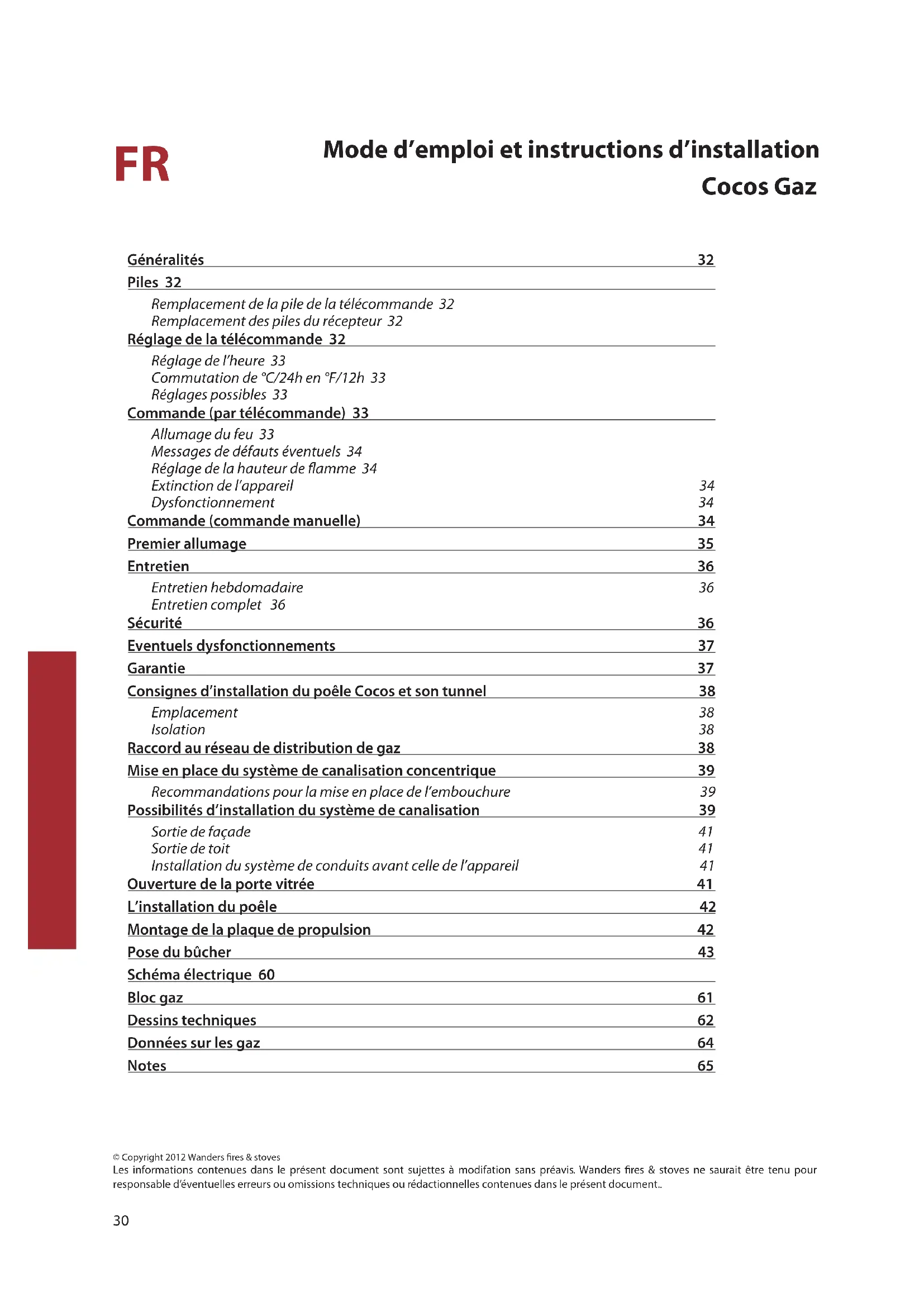 Mode d’emploi et instructions d’installation Cocos Gaz © Copyright 2012 Wanders res & stoves Les informations contenues dans le présent document sont sujettes à modifation sans préavis. Wanders res & stoves ne saurait être tenu pour responsable d’éventuelles erreurs ou omissions techniques ou rédactionnelles contenues dans le présent document.. Généralités 32 Piles 32 Remplacement de la pile de la télécommande 32 Remplacement des piles du récepteur 32 Réglage de la télécommande 32 Réglage de l’heure 33 Commutation de °C/24h en °F/12h 33 Réglages possibles 33 Commande (par télécommande) 33 Allumage du feu 33 Messages de défauts éventuels 34 Réglage de la hauteur de amme 34 Extinction de l’appareil 34 Dysfonctionnement 34 Commande (commande manuelle) 34 Premier allumage 35 Entretien 36 Entretien hebdomadaire 36 Entretien complet 36 Sécurité 36 Eventuels dysfonctionnements 37 Garantie 37 Consignes d’installation du poêle Cocos et son tunnel 38 Emplacement 38 Isolation 38 Raccord au réseau de distribution de gaz 38 Mise en place du système de canalisation concentrique 39 Recommandations pour la mise en place de l’embouchure 39 Possibilités d’installation du système de canalisation 39 Sortie de façade 41 Sortie de toit 41 Installation du système de conduits avant celle de l’appareil 41 Ouverture de la porte vitrée 41 L’installation du poêle 42 Montage de la plaque de propulsion 42 Pose du bûcher 43 Schéma électrique 60 Bloc gaz 61 Dessins techniques 62 Données sur les gaz 64 Notes 6531
