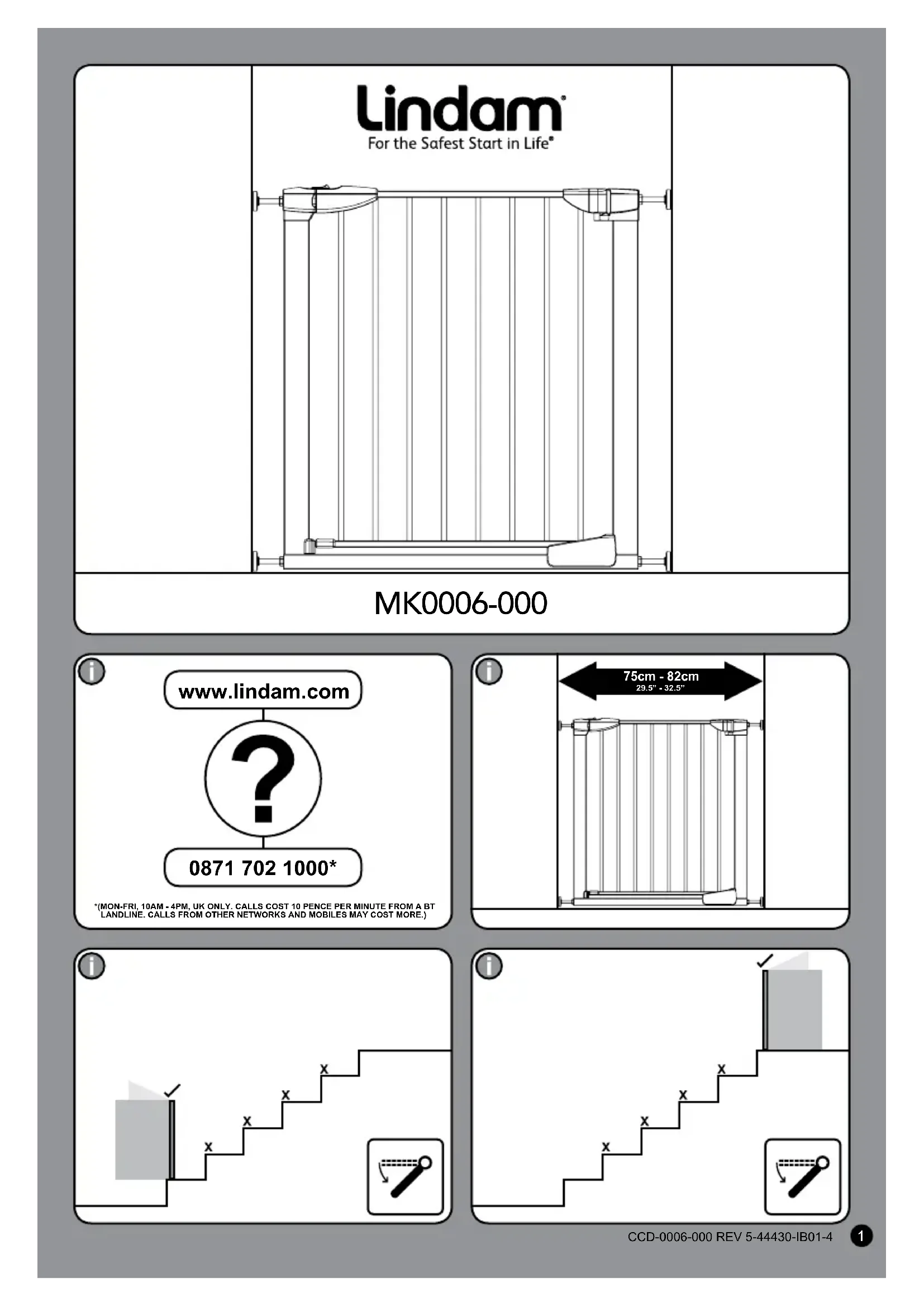 Veuillez lire attentivement ces instructions pour garantir une installation correcte. Des vidéos de démonstration sont également disponibles sur www.lindam.com pour faciliter l'installation. Veuillez inspecter immédiatement votre barrière de sécurité dès réception. Si vous constatez des dommages, ne montez pas la barrière et référez-vous au verso du livret d'instructions pour obtenir les coordonnées du site web ou du représentant du service clients. Nous vous recommandons de réaliser l'installation loin des jeunes enfants car certaines des petites pièces pourraient représenter un danger d'étouffement.