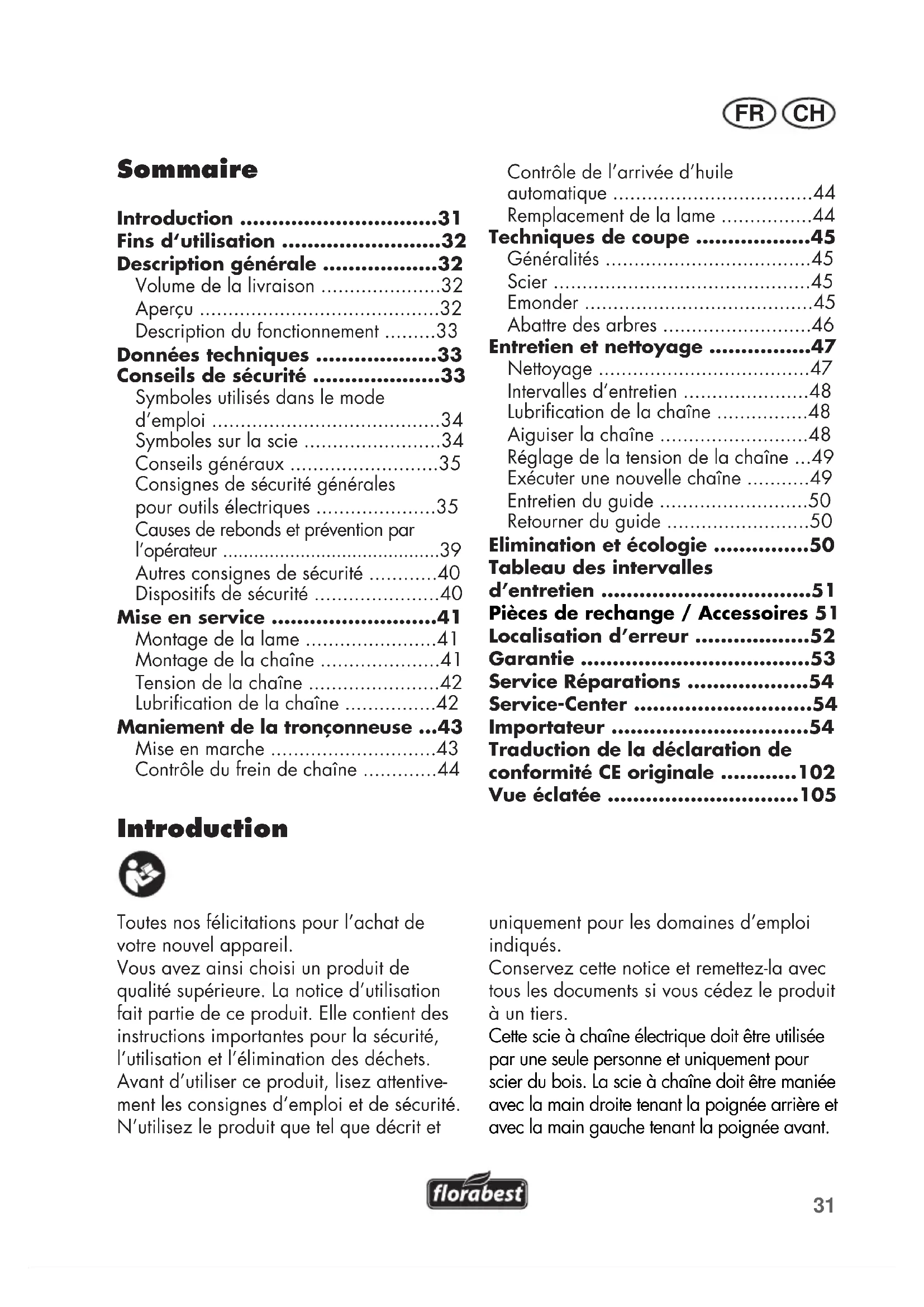 - Ein als defekt erfasstes Gerät können Sie, nach Rücksprache mit unserem Kundenservice, unter Beifügung des Kaufbelegs (Kassenbons) und der Angabe, worin der Mangel besteht und wann er aufgetreten ist, für Sie portofrei an die Ihnen mitgeteilte Service-Anschrift übersenden. Um An- nahmeprobleme und Zusatzkosten zu vermeiden, benutzen Sie unbedingt nur die Adresse, die Ihnen mitgeteilt wird. Stellen Sie sicher, dass der Versand nicht unfrei, per Sperrgut, Express oder sonstiger Sonderfracht erfolgt. Senden Sie das Gerät bitte inkl. aller beim Kauf mitgelieferten Zubehörteile ein und sorgen Sie für eine ausreichend sichere Transportverpackung. Reparatur-Service Sie können Reparaturen, die nicht der Ga- rantie unterliegen, gegen Berechnung von unserer Service-Niederlassung durchführen lassen. Sie erstellt Ihnen gerne einen Kos- tenvoranschlag. Wir können nur Geräte bearbeiten, die ausreichend verpackt und frankiert einge- sandt wurden. Achtung: Bitte senden Sie Ihr Gerät gerei- nigt und mit Hinweis auf den Defekt an unsere Service-Niederlassung. Nicht angenommen werden unfrei - per Sperrgut, Express oder mit sonstiger Son- derfracht - eingeschickte Geräte. Die Entsorgung Ihrer defekten eingesende- ten Geräte führen wir kostenlos durch.31 CHFR Introduction Toutes nos félicitations pour l’achat de votre nouvel appareil. Vous avez ainsi choisi un produit de qualité supérieure. La notice d’utilisation fait partie de ce produit. Elle contient des instructions importantes pour la sécurité, l’utilisation et l’élimination des déchets. Avant d’utiliser ce produit, lisez attentive- ment les consignes d’emploi et de sécurité. N’utilisez le produit que tel que décrit et Sommaire Introduction ...............................31 Fins d‘utilisation .........................32 Description générale ..................32 Volume de la livraison .....................32 Aperçu ..........................................32 Description du fonctionnement .........33 Données techniques ...................33 Conseils de sécurité ....................33 Symboles utilisés dans le mode d’emploi ........................................34 Symboles sur la scie ........................34 Conseils généraux ..........................35 Consignes de sécurité générales pour outils électriques .....................35 Causes de rebonds et prévention par l’opérateur ..........................................39 Autres consignes de sécurité ............40 Dispositifs de sécurité ......................40 Mise en service ..........................41 Montage de la lame .......................41 Montage de la chaîne .....................41 Tension de la chaîne .......................42 Lubrication de la chaîne ................42 Maniement de la tronçonneuse ...43 Mise en marche .............................43 Contrôle du frein de chaîne .............44 Contrôle de l’arrivée d’huile automatique ...................................44 Remplacement de la lame ................44 Techniques de coupe ..................45 Généralités ....................................45 Scier .............................................45 Emonder ........................................45 Abattre des arbres ..........................46 Entretien et nettoyage ................47 Nettoyage .....................................47 Intervalles d’entretien ......................48 Lubrication de la chaîne ................48 Aiguiser la chaîne ..........................48 Réglage de la tension de la chaîne ...49 Exécuter une nouvelle chaîne ...........49 Entretien du guide ..........................50 Retourner du guide .........................50 Elimination et écologie ...............50 Tableau des intervalles d’entretien .................................51 Pièces de rechange / Accessoires 51 Localisation d’erreur ..................52 Garantie ....................................53 Service Réparations ...................54 Service-Center ............................54 Importateur ...............................54 Traduction de la déclaration de conformité CE originale ............102 Vue éclatée ..............................105 uniquement pour les domaines d’emploi indiqués. Conservez cette notice et remettez-la avec tous les documents si vous cédez le produit à un tiers. Cette scie à chaîne électrique doit être utilisée par une seule personne et uniquement pour scier du bois. La scie à chaîne doit être maniée avec la main droite tenant la poignée arrière et avec la main gauche tenant la poignée avant.32 FR CH Avant d’utiliser la scie à chaîne, l’utilisateur doit avoir lu et compris toutes les instructions et consignes contenues dans le mode d’em-ploi. L’utilisateur doit porter un équipement de protection personnel (EPP) adapté. La scie à chaîne ne doit servir qu’uniquement à couper du bois. Les matériaux tels que, par exemple, du plastique, des pierres, des métaux ou du bois qui contiennent des corps étrangers (par exemple, des clous ou des vis), ne doivent pas être coupés par la scie ! Fins d‘ utilisation La tronçonneuse est conçue uniquement pour couper du bois. La tronçonneuse n’est pas prévue pour tous les autres types d’utilisation (par ex. coupe de maçonne-rie, de matière plastique ou de produits alimentaires). La tronçonneuse est prévue pour une utilisation dans le domaine du bricolage amateur. Elle n’a pas été conçue pour une utilisation professionnelle. L’appareil est prévu pour être manipulé par des adultes. Les adolescents de plus de 16 ans peuvent utiliser la tronçonneuse sous surveillance. Le fabricant ne peut pas être tenu responsable des dommages causés par une utilisation contraire à l’affectation originale ou à une manipulation incorrecte. Description générale Volume de la livraison - Tronçonneuse électrique- Guide - Chaîne de scie - Fourreau de protection de lame- 180 ml huil
