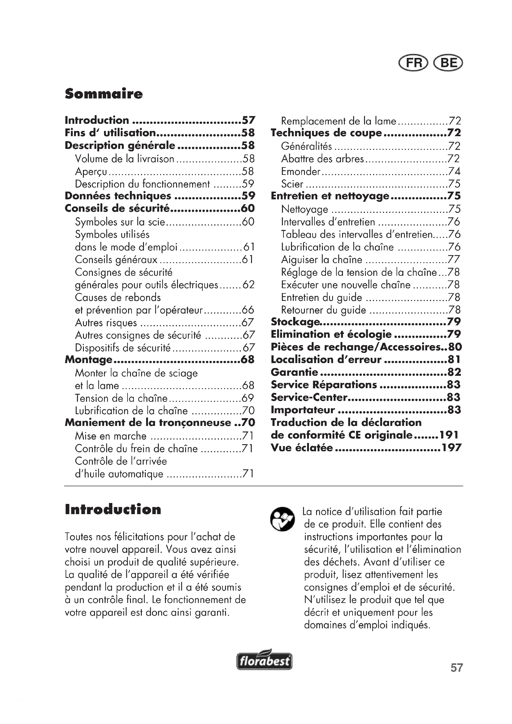 Niveau de puissance acoustique garantiSymboles sur la plaque signalétique : Les machines n’ont pas leur place dans les ordures ménagères. 460 mmLongueur de chaîne de scie Outil de classe II (Double isolation)Symbole sous le capot de la roue dentée : l‘outil électroportatif est éteint, et ceux au cours desquels il est certes allumé mais fonctionne hors charge). Conseils de sécurité Ce chapitre traite des consignes de sécurité de base lors du travail avec une tronçonneuse électrique. Une tronçonneuse électrique est un appareil dangereux qui peut causer des blessures graves ou mêmes mortelles en cas de maniement incorrect ou négligent. Pour votre sécurité et la sécurité des autres, respectez donc constamment les consignes de sécurité suivantes et demandez conseil à un spécialiste en cas de doute. Symboles sur la scie Avant de travailler, familiarisez-vous avec toutes les manettes. Entraînez-vous au maniement de la tronçonneuse et demandez à un spécialiste de vous expliquer le fonctionnement, l’effet et les techniques de coupe. Il est impossible de mettre le moteur en marche si le frein de chaîne est enclenché. Déverrouillez le frein de chaîne en poussant le levier de frein contre la poignée avant. Lisez et respectez le mode d’emploi de la machine! Portez un équipement de protection individuelle. Porter une protection visuelle et acoustique61 BEFR Signes indicatifs avec conseils de prévention des dégâts. Portez des gants de protection pour éviter les coupures ! Signes de conseils avec des informations pour une meilleure manipulation de l’appareil. Conseils généraux Avant de travailler avec la tronçonneuse électrique, familiarisez-vous avec toutes les pièces. Exercez -vous avec la scie (raccourcissement de bois rond sur un chevalet) et faites vous expliquer le fonctionnement, le mode d’action, les techniques de sciage et l’équipement de protection personnelle par un utilisateur expérimenté ou un spécialiste. Respectez la protection sonore et les directives locales pour la coupe de bois. Les dispositions locales peuvent requérir un con- trôle d‘aptitude. Adressez-vous à l‘administration forestière. Attention ! Lors de l‘utilisation d‘outils électriques, les mesures de sécurité fondamentales suivantes doivent être observées pour la protection contre le choc électrique, le risque de bles- sure et le risque d‘incendie : Il y a un risque de blessures. Respecter le sens de rotation de la chaîne de coupe. Attention ! Lire la notice d‘utilisation. Symboles sur la lame : Sens de rotation de la chaîne de coupe Symboles sur le capot du réservoir d‘huile : Graisser la chaîne de coupe. Symboles sur la vis de xation du capot de la roue dentée : OUVERT FERMÉ Symboles sur le levier de frein de la chaîne : frein de la chaîne : ARRÊT frein de la chaîne : MARCHE Symboles sur la vis du système de tension rapide de la chaîne : dévisser tendre Symboles utilisés dans le mode d’emploi Signes de danger avec conseils de prévention des accidents sur les personnes ou des dégâts matériels. Pictogramme de danger avec informations de prévention des dommages aux personnes par décharge électrique.62 FR BE Consignes de sécurité géné- rales pour outils électriques AVERTISSEMENT ! Lisez toutes les consignes de sécurité et les instructions. Des omissions lors de l‘observation des consignes de sécurité et des instructions peuvent causer une décharge électrique, un incendie et / ou de graves blessures. Conservez toutes les consignes de sécurité et les instructions pour les consulter ultérieurement. Le terme «outil» dans les avertissements fait référence à votre outil électrique alimenté par le secteur (avec cordon d’alimentation) ou votre outil fonctionnant sur batterie (sans cordon d’alimentation). Sécurité de la zone de travail