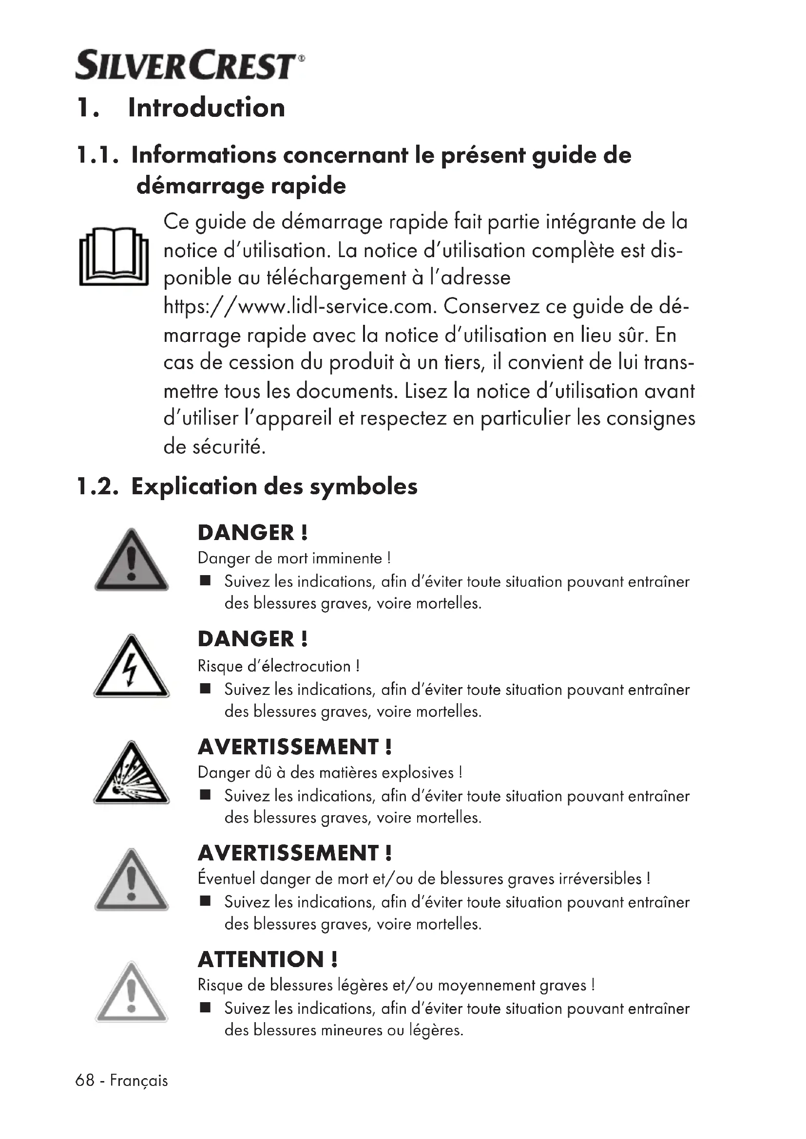 1.1. Informations concernant le présent guide de démarrage rapide Ce guide de démarrage rapide fait partie intégrante de la notice d’utilisation. La notice d’utilisation complète est dis- ponible au téléchargement à l’adresse https://www.lidl-service.com. Conservez ce guide de dé- marrage rapide avec la notice d’utilisation en lieu sûr. En cas de cession du produit à un tiers, il convient de lui trans- mettre tous les documents. Lisez la notice d’utilisation avant d’utiliser l’appareil et respectez en particulier les consignes de sécurité. 1.2. Explication des symboles DANGER! Danger de mort imminente! Suivez les indications, afin d’éviter toute situation pouvant entraîner des blessures graves, voire mortelles. DANGER! Risque d’électrocution! Suivez les indications, afin d’éviter toute situation pouvant entraîner des blessures graves, voire mortelles. AVERTISSEMENT! Danger dû à des matières explosives! Suivez les indications, afin d’éviter toute situation pouvant entraîner des blessures graves, voire mortelles. AVERTISSEMENT! Éventuel danger de mort et/ou de blessures graves irréversibles! Suivez les indications, afin d’éviter toute situation pouvant entraîner des blessures graves, voire mortelles. ATTENTION! Risque de blessures légères et/ou moyennement graves! Suivez les indications, afin d’éviter toute situation pouvant entraîner des blessures mineures ou légères.Français -69 AVIS! Respectez les consignes afin d’éviter tout dommage matériel! Suivez les instructions pour éviter toute situation pouvant entraîner des dommages matériels. Instructions de montage ou d’utilisation Tenez compte des remarques contenues dans la notice d’utilisation!