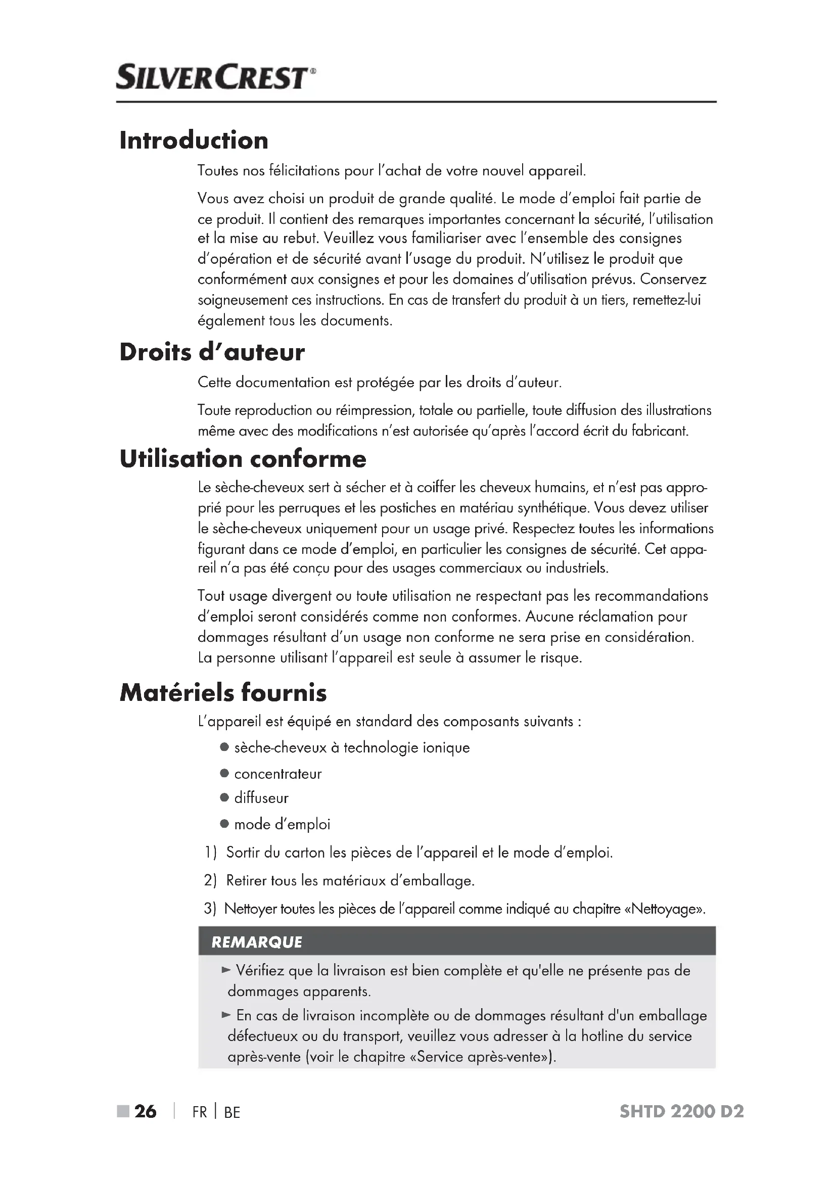 SHTD 2200 D2 Introduction Toutes nos félicitations pour l’achat de votre nouvel appareil. Vous avez choisi un produit de grande qualité. Le mode d’emploi fait partie de ce produit. Il contient des remarques importantes concernant la sécurité, l’utilisation et la mise au rebut. Veuillez vous familiariser avec l’ensemble des consignes d’opération et de sécurité avant l’usage du produit. N’utilisez le produit que conformément aux consignes et pour les domaines d’utilisation prévus. Conservez soigneusement ces instructions. En cas de transfert du produit à un tiers, remettez-lui également tous les documents. Droits d’auteur Cette documentation est protégée par les droits d’auteur. Toute reproduction ou réimpression, totale ou partielle, toute diffusion des illustrations même avec des modifications n’est autorisée qu’après l’accord écrit du fabricant. Utilisation conforme Le sèche-cheveux sert à sécher et à coiffer les cheveux humains, et n’est pas appro- prié pour les perruques et les postiches en matériau synthétique. Vous devez utiliser le sèche-cheveux uniquement pour un usage privé. Respectez toutes les informations figurant dans ce mode d’emploi, en particulier les consignes de sécurité. Cet appa- reil n’a pas été conçu pour des usages commerciaux ou industriels. Tout usage divergent ou toute utilisation ne respectant pas les recommandations d’emploi seront considérés comme non conformes. Aucune réclamation pour dommages résultant d’un usage non conforme ne sera prise en considération. La personne utilisant l’appareil est seule à assumer le risque. Matériels fournis L’appareil est équipé en standard des composants suivants : ▯ sèche-cheveux à technologie ionique ▯ concentrateur ▯ diffuseur ▯ mode d’emploi