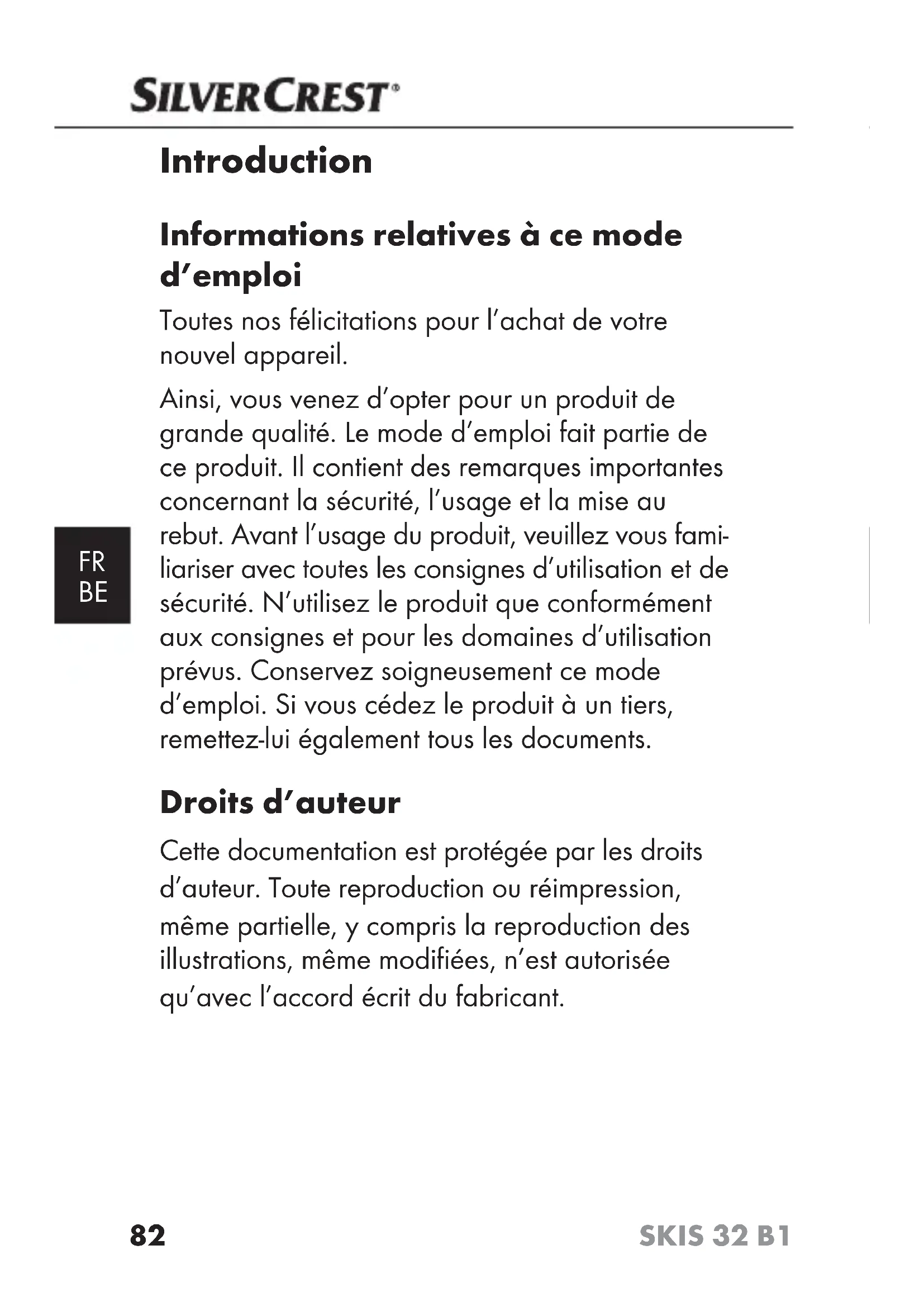 SKIS 32 B1 Introduction Informations relatives à ce mode d’emploi Toutes nos félicitations pour l’achat de votre nouvel appareil. Ainsi, vous venez d’opter pour un produit de grande qualité. Le mode d’emploi fait partie de ce produit. Il contient des remarques importantes concernant la sécurité, l’usage et la mise au rebut. Avant l’usage du produit, veuillez vous fami- liariser avec toutes les consignes d’utilisation et de sécurité. N’utilisez le produit que conformément aux consignes et pour les domaines d’utilisation prévus. Conservez soigneusement ce mode d’emploi. Si vous cédez le produit à un tiers, remettez-lui également tous les documents. Droits d’auteur Cette documentation est protégée par les droits d’auteur. Toute reproduction ou réimpression, même partielle, y compris la reproduction des illustrations, même modifiées, n’est autorisée qu’avec l’accord écrit du fabricant.83 SKIS 32 B1