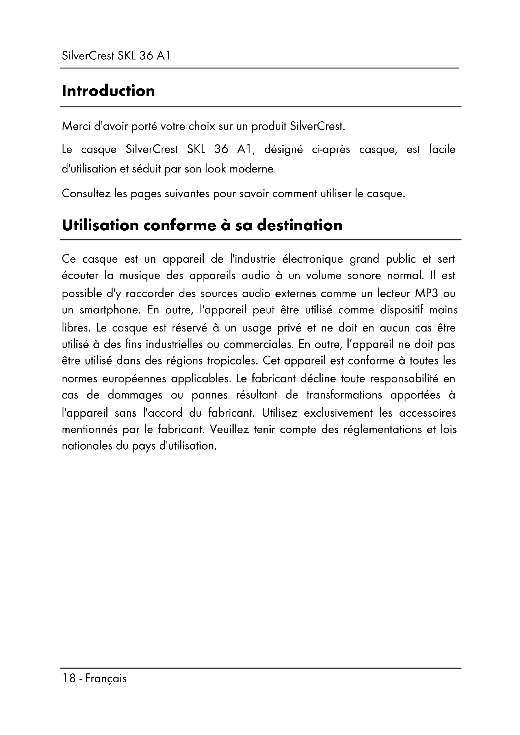 Introduction Merci d'avoir porté votre choix sur un produit SilverCrest. Le casque SilverCrest SKL 36 A1, désigné ci-après casque, est facile d'utilisation et séduit par son look moderne. Consultez les pages suivantes pour savoir comment utiliser le casque. Utilisation conforme à sa destination Ce casque est un appareil de l'industrie électronique grand public et sert écouter la musique des appareils audio à un volume sonore normal. Il est possible d'y raccorder des sources audio externes comme un lecteur MP3 ou un smartphone. En outre, l'appareil peut être utilisé comme dispositif mains libres. Le casque est réservé à un usage privé et ne doit en aucun cas être utilisé à des fins industrielles ou commerciales. En outre, l’appareil ne doit pas être utilisé dans des régions tropicales. Cet appareil est conforme à toutes les normes européennes applicables. Le fabricant décline toute responsabilité en cas de dommages ou pannes résultant de transformations apportées à l'appareil sans l'accord du fabricant. Utilisez exclusivement les accessoires mentionnés par le fabricant. Veuillez tenir compte des réglementations et lois nationales du pays d'utilisation.SilverCrest SKL 36 A1 Français - 19 Contenu du coffret