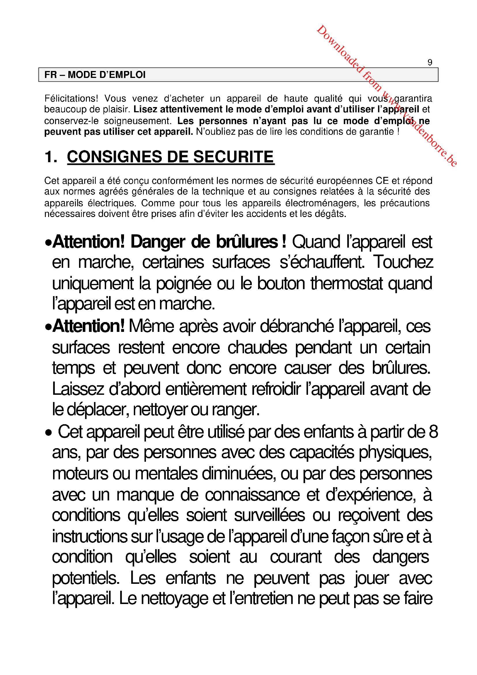 - Cet appareil peut être utilisé par des enfants à partir de 8 ans, par des personnes avec des capacités physiques, moteurs ou mentales diminuées, ou par des personnes avec un manque de connaissance et d’expérience, à conditions qu’elles soient surveillées ou reçoivent des instructions sur l’usage de l’appareil d’une façon sûre et à condition qu’elles soient au courant des dangers potentiels. Les enfants ne peuvent pas jouer avec l’appareil. Le nettoyage et l’entretien ne peut pas se faire Downloaded from www.vandenborre.be10 par des enfants, à moins qu’ils aient au minimum 8 ans et qu’ils soient surveillés. Gardez l’appareil et le cordon hors de la portée des enfants plus jeunes que 8 ans.