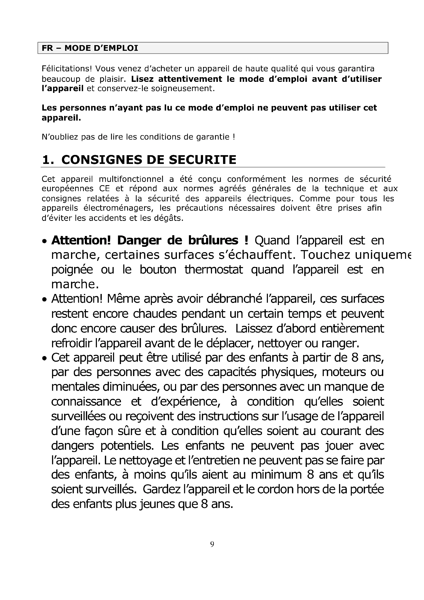 Cet appareil multifonctionnel a été conçu conformément les normes de sécurité européennes CE et répond aux normes agréés générales de la technique et aux consignes relatées à la sécurité des appareils électriques. Comme pour tous les appareils électroménagers, les précautions nécessaires doivent être prises afin d’éviter les accidents et les dégâts. Attention! Danger de brûlures ! Quand l’appareil est en marche, certaines surfaces s’échauffent. Touchez uniquement la poignée ou le bouton thermostat quand l’appareil est en marche. Attention! Même après avoir débranché l’appareil, ces surfaces restent encore chaudes pendant un certain temps et peuvent donc encore causer des brûlures. Laissez d’abord entièrement refroidir l’appareil avant de le déplacer, nettoyer ou ranger. Cet appareil peut être utilisé par des enfants à partir de 8 ans, par des personnes avec des capacités physiques, moteurs ou mentales diminuées, ou par des personnes avec un manque de connaissance et d’expérience, à condition qu’elles soient surveillées ou reçoivent des instructions sur l’usage de l’appareil d’une façon sûre et à condition qu’elles soient au courant des dangers potentiels. Les enfants ne peuvent pas jouer avec l’appareil. Le nettoyage et l’entretien ne peuvent pas se faire par des enfants, à moins qu’ils aient au minimum 8 ans et qu’ils soient surveillés. Gardez l’appareil et le cordon hors de la portée des enfants plus jeunes que 8 ans.10 Ne JAMAIS immerger l’appareil, le cordon d’alimentation ni la fiche dans l’eau. Nettoyez-les uniquement avec un chiffon humide. Un appareil endommagé peut causer des électrochocs. Ne JAMAIS utiliser l’appareil quand celui-ci est endommagé, est tombé ou montre un dérèglement, ou quand le cordon ou la prise sont endommagés. Dans tous ces cas, retournez l’appareil à votre point de vente ou à un service de réparation agrée. Retirez toujours la fiche de la prise dès que le travail est terminé et avant de démonter l'appareil pour le nettoyer. Ne JAMAIS utiliser de minuteurs ou de systèmes à télécommande externes. Toujours placer l’appareil sur une surface stable, comme une tablette de cuisine ou une table, pour éviter que l’appareil ne puisse basculer ou glisser. Ne JAMAIS utiliser l’appareil en dehors de la maison. Ne JAMAIS utiliser de rallonge ou de prise de contact. Branchez toujours l’appareil à une prise directe. Déroulez toujours entièrement le cordon d’alimentation. Ne laissez JAMAIS le cordon pendre sur le côté d'une table ou d’un plan de travail. Tenez-le éloigné des surfaces chaudes (par exemple plaques de cuisson, fours, etc.). N‘utilisez l’appareil que sur la tension réseau comme indiquée sur la plaque signalétique. Cet appareil n’est prévu qu’à usage domestique, et non à l’usage professionnel. Ne JAMAIS utiliser l’appareil quand celui-ci est endommagé, est tombé ou montre un dérèglement, ou quand le cordon ou la prise sont endommagés. Dans tous ces cas, retournez l’appareil à votre point de vente ou à un service de réparation agrée.