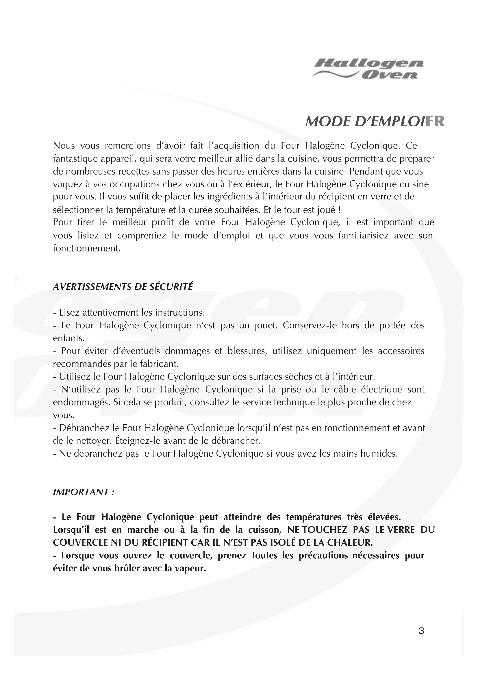 - Lisez attentivement les instructions. - Le Four Halogène Cyclonique n’est pas un jouet. Conservez-le hors de portée des enfants. - Pour éviter d’éventuels dommages et blessures, utilisez uniquement les accessoires recommandés par le fabricant. - Utilisez le Four Halogène Cyclonique sur des surfaces sèches et à l’intérieur. - N’utilisez pas le Four Halogène Cyclonique si la prise ou le câble électrique sont endommagés. Si cela se produit, consultez le service technique le plus proche de chez vous. - Débranchez le Four Halogène Cyclonique lorsqu’il n’est pas en fonctionnement et avant de le nettoyer. Éteignez-le avant de le débrancher. - Ne débranchez pas le Four Halogène Cyclonique si vous avez les mains humides. IMPORTANT : - Le Four Halogène Cyclonique peut atteindre des températures très élevées. Lorsqu’il est en marche ou à la n de la cuisson, NE TOUCHEZ PAS LE VERRE DU COUVERCLE NI DU RÉCIPIENT CAR IL N’EST PAS ISOLÉ DE LA CHALEUR. - Lorsque vous ouvrez le couvercle, prenez toutes les précautions nécessaires pour éviter de vous brûler avec la vapeur.
