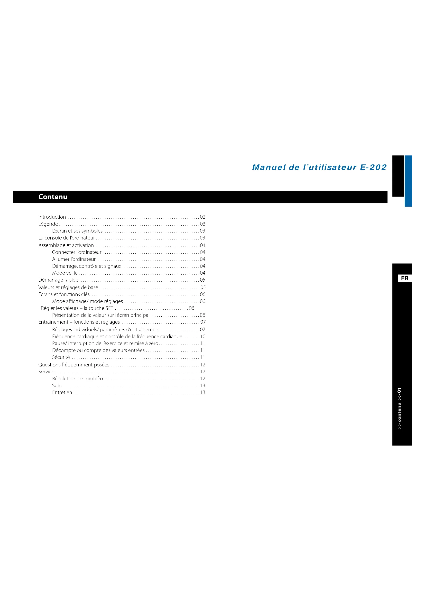 - Falls Sie trockene Hände haben, befeuchten Sie die Handächen ein wenig. Der Computer ist abgestürzt In seltenen Fällen kann es, vorwiegend durch Spannungsveränderungen oder statische Entladungen, zum Absturz des Computers kommen. Norma- lerweise startet der E-202 wieder selbstständig. Sollte der Computer nicht selbständig neu starten, führen Sie einen Neustart durch. Entfernen Sie dazu kurzzeitig die Batterien und legen Sie sie wieder ein.DE >> service >> 13 Pege Achten Sie darauf, dass keine Flüssigkeit in das Gehäuse des Computers eindringt. Reinigen Sie den Computer mit einem feuchten Tuch. Verwenden Sie keine scharfen Reinigungsmittel. Wartung Der Computer bedarf keiner speziellen Wartung. Kontrollieren Sie regelmäßig den festen Sitz der Schrauben und Verbindungen. Tauschen Sie defekte Teile sofort aus. Setzen Sie sich dazu mit dem ENERGETICS-Hämdler in Verbindung.Bedienungsanleitung >> 14FR Contenu Introduction .............................................................02 Légende .................................................................03 L’écran et ses symboles ............................................03 La console de l’ordinateur ................................................03 Assemblage et activation ................................................04 Connecter l’ordinateur .............................................04 Allumer l’ordinateur ...............................................04 Démarrage, contrôle et signaux ...................................04 Mode veille ........................................................04 Démarrage rapide . . . . . . . . . . . . . . . . . . . . . . . . . . . . . . . . . . . . . . . . . . . . . . . . . . . . . . . 05 Valeurs et réglages de base ..............................................05 Ecrans et fonctions clés ..................................................06 Mode affichage/ mode réglages ...................................06 Régler les valeurs – la touche SET ..................................06 Présentation de la valeur sur l‘écran principal ......................06 Entraînement – fonctions et réglages . . . . . . . . . . . . . . . . . . . . . . . . . . . . . . . . . . . . 07 Réglages individuels/ paramètres d‘entraînement ..................07 Fréquence cardiaque et contrôle de la fréquence cardiaque .......10 Pause/ interruption de l‘exercice et remise à zéro ...................11 Décompte ou compte des valeurs entrées .........................11 Sécurité ...........................................................11 Questions fréquemment posées .........................................12 Service ..................................................................12 Résolution des problèmes .........................................12 Soin .............................................................13 Entretien ..........................................................13 >> contenu >> 01 Manuel de l’utilisateur E-202Manuel de l’utilisateur >> introduction >> 02 Introduction Cher Client Nous vous remercions d’avoir choisi un équipement de Fitness ENERGETICS. L’ordinateur offre les fonctions standards nécessaires pour contrôler facile- ment votre entraînement et concevoir vos exercices. Toutes les valeurs collectées pendant l‘exercice sont scannées sur l‘écran. Vous pouvez aussi choisir de voir une valeur spécifique individuellement à tout moment pendant l‘exercice. La mesure et l‘affichage de votre fréquence cardiaque en particulier vous offrent la possibilité de gérer votre entraînement via les fondamentaux importants pour un entraînement efficace, comme déterminé par la science du sport. Avant de commencer votre entraînement, veuillez lire attentivement le manuel de l’ordinateur. Nous vous souhaitons du succès et un plaisir continu à l’utilisation de votre équipement de Fitness ENERGETICS. Votre équipe ENERGETICSFR >> légende >> 03 L’écran et ses symboles (D1) Ecran principal – scanne les différents réglages et les valeurs importantes (D2) STOP – recueil des données interrompu, pas d‘activité (D3) clignote: transmission de fréquence cardiaque active (D4) SCAN – collecte de données active (D5) TIME – session d‘entraînement (minutes) (D6) SP – vitesse (kilomètre/ heure) (D7) RPM – cadence (tours de pédale/ minute) (D8) DIST – nombre total de kilomètres parcourus (D9) CAL – calories consommées mesurées en kilojoules (D10) ODO – distance totale en kilomètres (D11) PULSE – fréquence cardiaque en battements par minute (D12) K – unité utilisée pour la mesure (kilomètre) ou kilomètre/ heure La console de l’ordinateur Devant (C1) Ecran – indique toutes les valeurs importantes mesurées et calculées et les fonctions (C2) MODE – scanne les fonctions pendant l‘entraînement (C3) SET – confirme la sélection d‘un programme ou d‘une valeur (C4) RESET