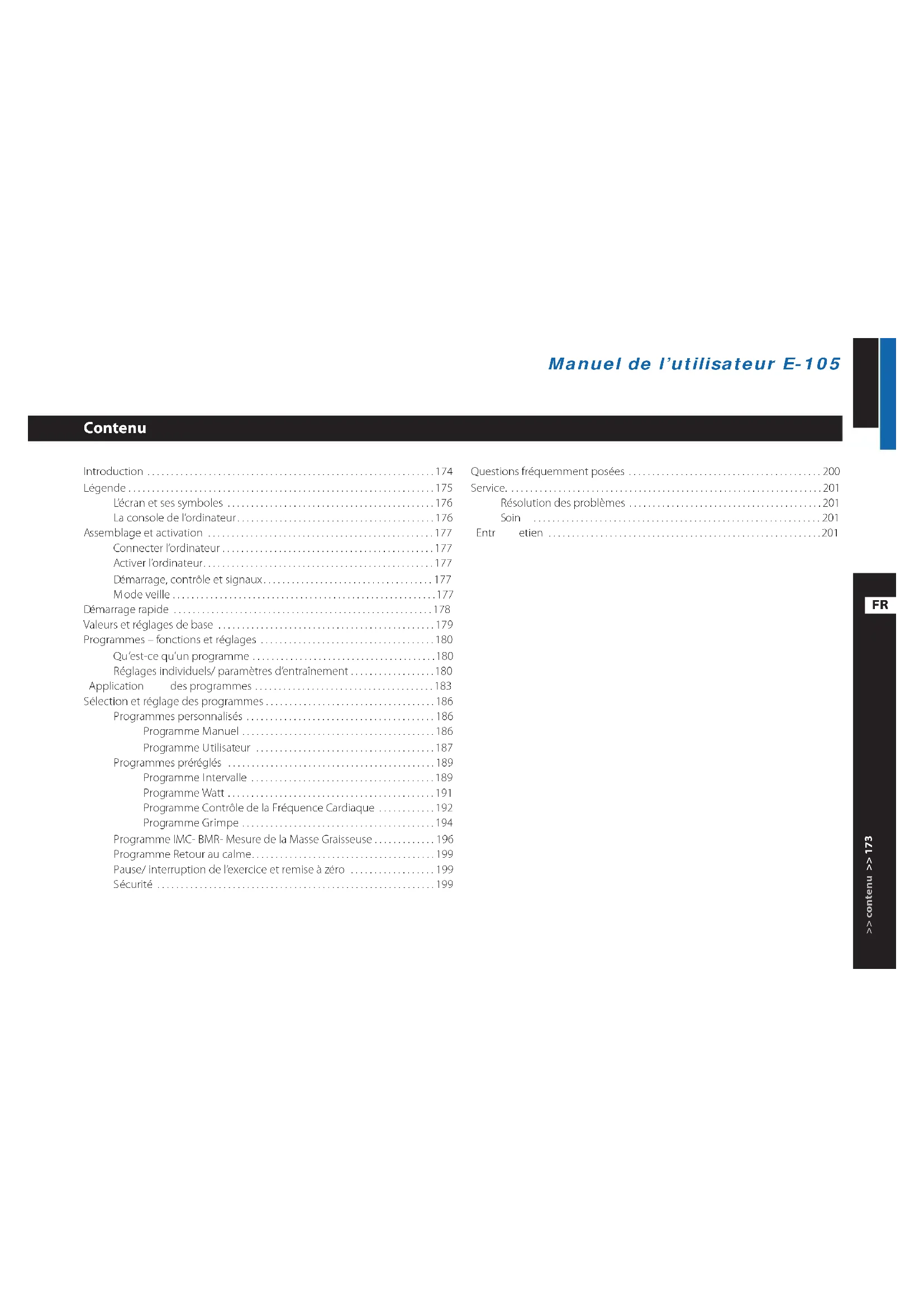 oin . . . . . . . . . . . . . . . . . . . . . . . . . . . . . . . . . . . . . . . . . . . . . . . . . . . . . . . . . . . . . 201 Entr etien . . . . . . . . . . . . . . . . . . . . . . . . . . . . . . . . . . . . . . . . . . . . . . . . . . . . . . . . . . 201 Manuel de l’utilisateur E-105 >> contenu >> 173Manuel de l’utilisateur >> introduction >> 174 Introduction Cher Client Nous vous remercions d’avoir choisi un équipement de Fitness ENERGETICS. L’ordinateur ore une multitude de possibilités pour concevoir un entraî