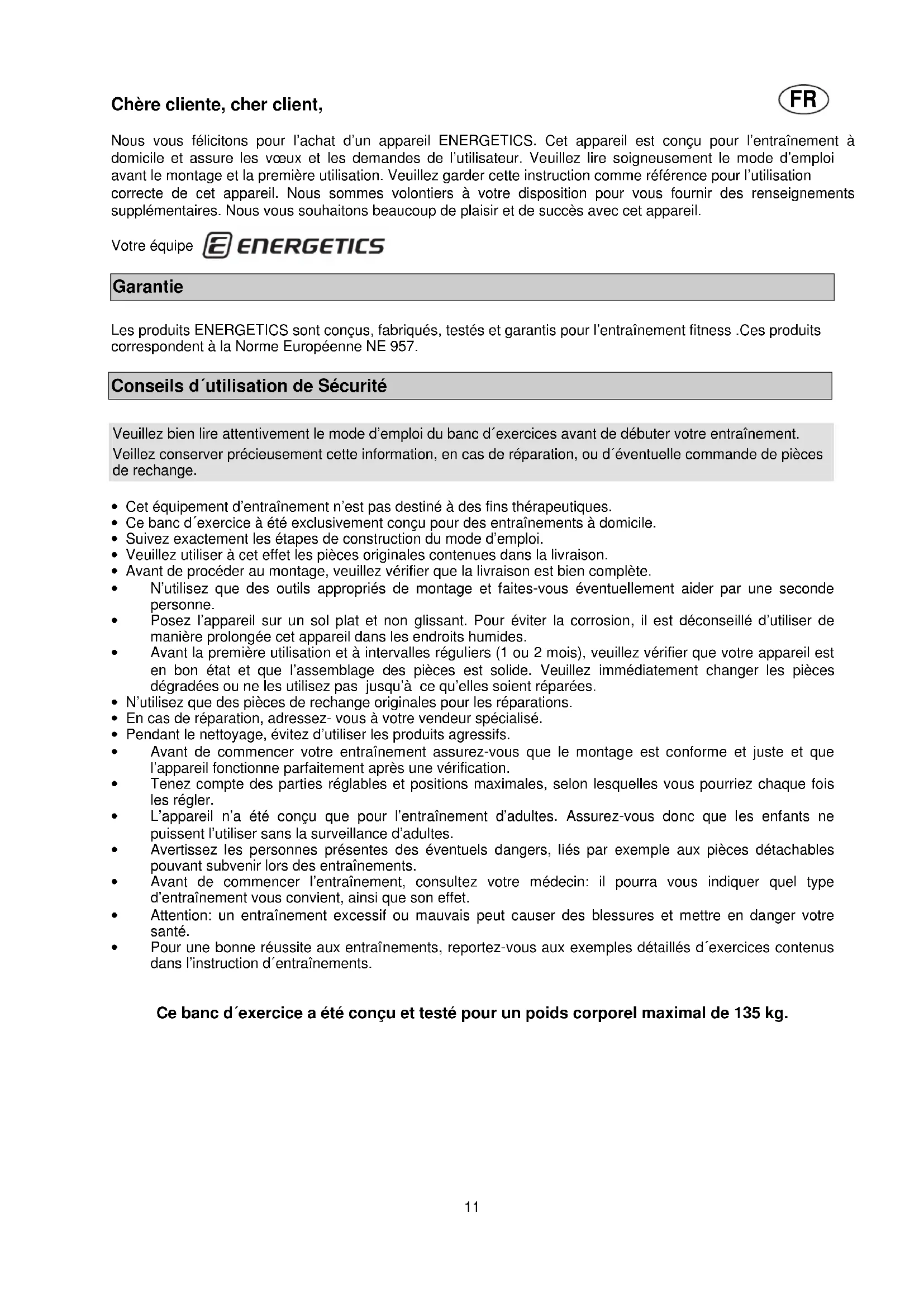 Chère cliente, cher client, Nous vous félicitons pour l’achat d’un appareil ENERGETICS. Cet appareil est conçu pour l’entraînement à domicile et assure les vœux et les demandes de l’utilisateur. Veuillez lire soigneusement le mode d’emploi avant le montage et la première utilisation. Veuillez garder cette instruction comme référence pour l’utilisation correcte de cet appareil. Nous sommes volontiers à votre disposition pour vous fournir des renseignements supplémentaires. Nous vous souhaitons beaucoup de plaisir et de succès avec cet appareil. Votre équipe Garantie Les produits ENERGETICS sont conçus, fabriqués, testés et garantis pour l’entraînement fitness .Ces produits correspondent à la Norme Européenne NE 957. Conseils d´utilisation de Sécurité