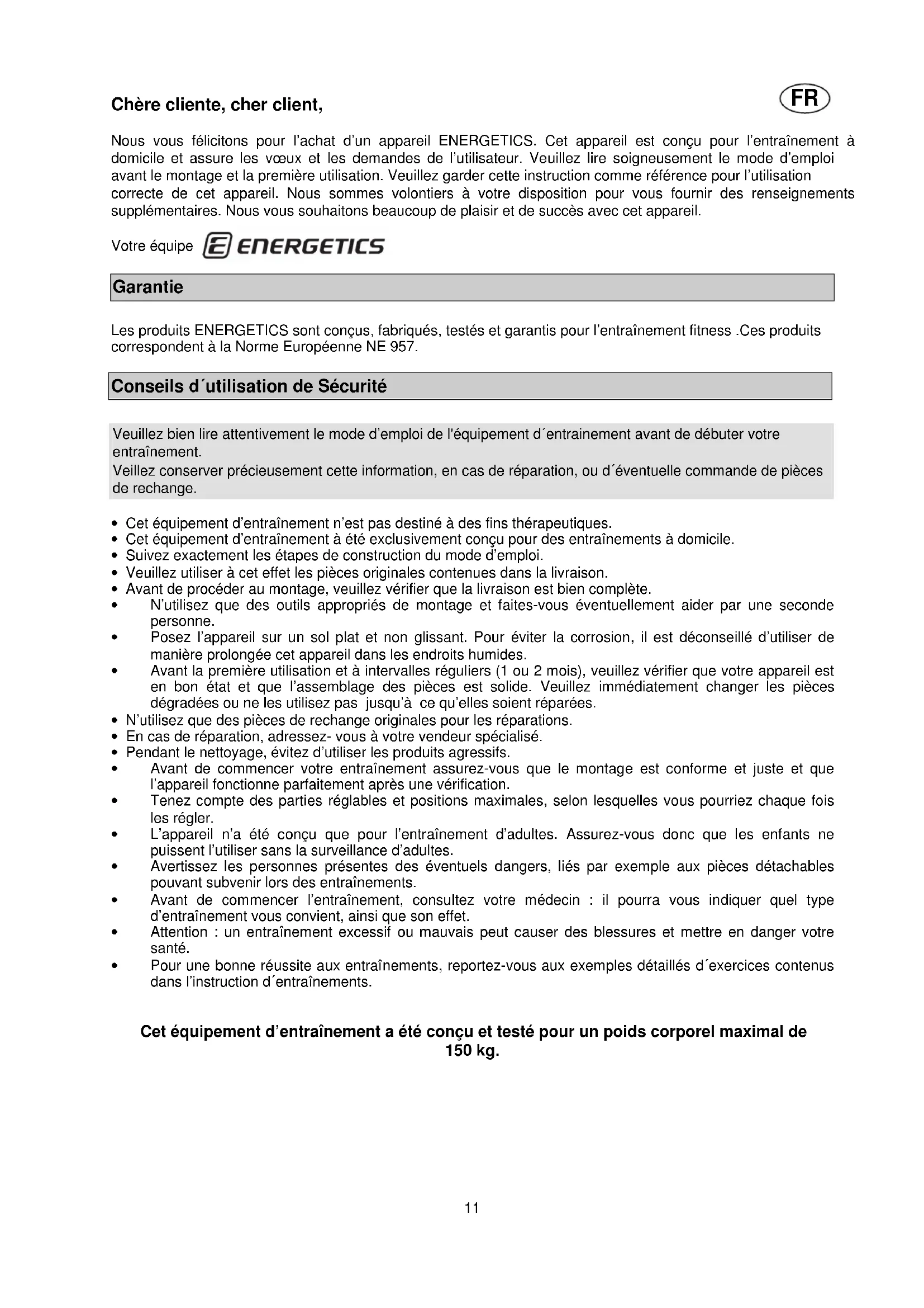 Chère cliente, cher client, Nous vous félicitons pour l’achat d’un appareil ENERGETICS. Cet appareil est conçu pour l’entraînement à domicile et assure les vœux et les demandes de l’utilisateur. Veuillez lire soigneusement le mode d’emploi avant le montage et la première utilisation. Veuillez garder cette instruction comme référence pour l’utilisation correcte de cet appareil. Nous sommes volontiers à votre disposition pour vous fournir des renseignements supplémentaires. Nous vous souhaitons beaucoup de plaisir et de succès avec cet appareil. Votre équipe Garantie Les produits ENERGETICS sont conçus, fabriqués, testés et garantis pour l’entraînement fitness .Ces produits correspondent à la Norme Européenne NE 957. Conseils d´utilisation de Sécurité
