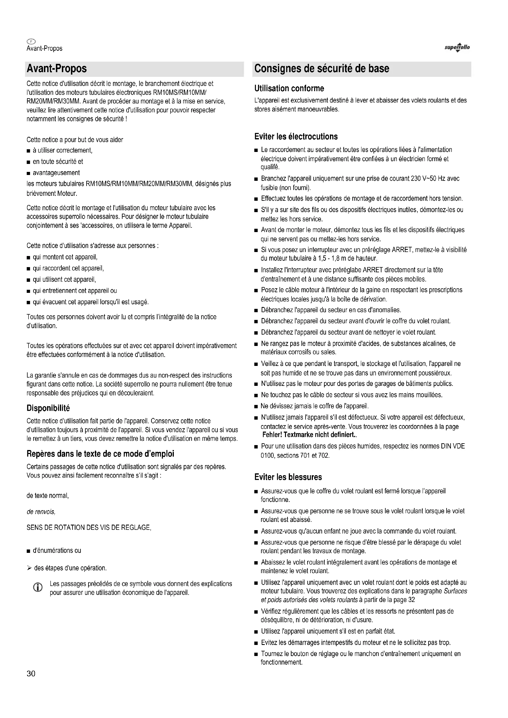 Cette notice d'utilisation décrit le montage, le branchement électric et l'utilisation des moteurs tubulaires électroniques RM10MS/RM10MM/ RM20MM/RM30MM. Avant de procéder au montage et à la mise en service, veuillez tire attentivement cette notice d'utilisation pour pouvoir respecter notamment les consignes de sécurité !